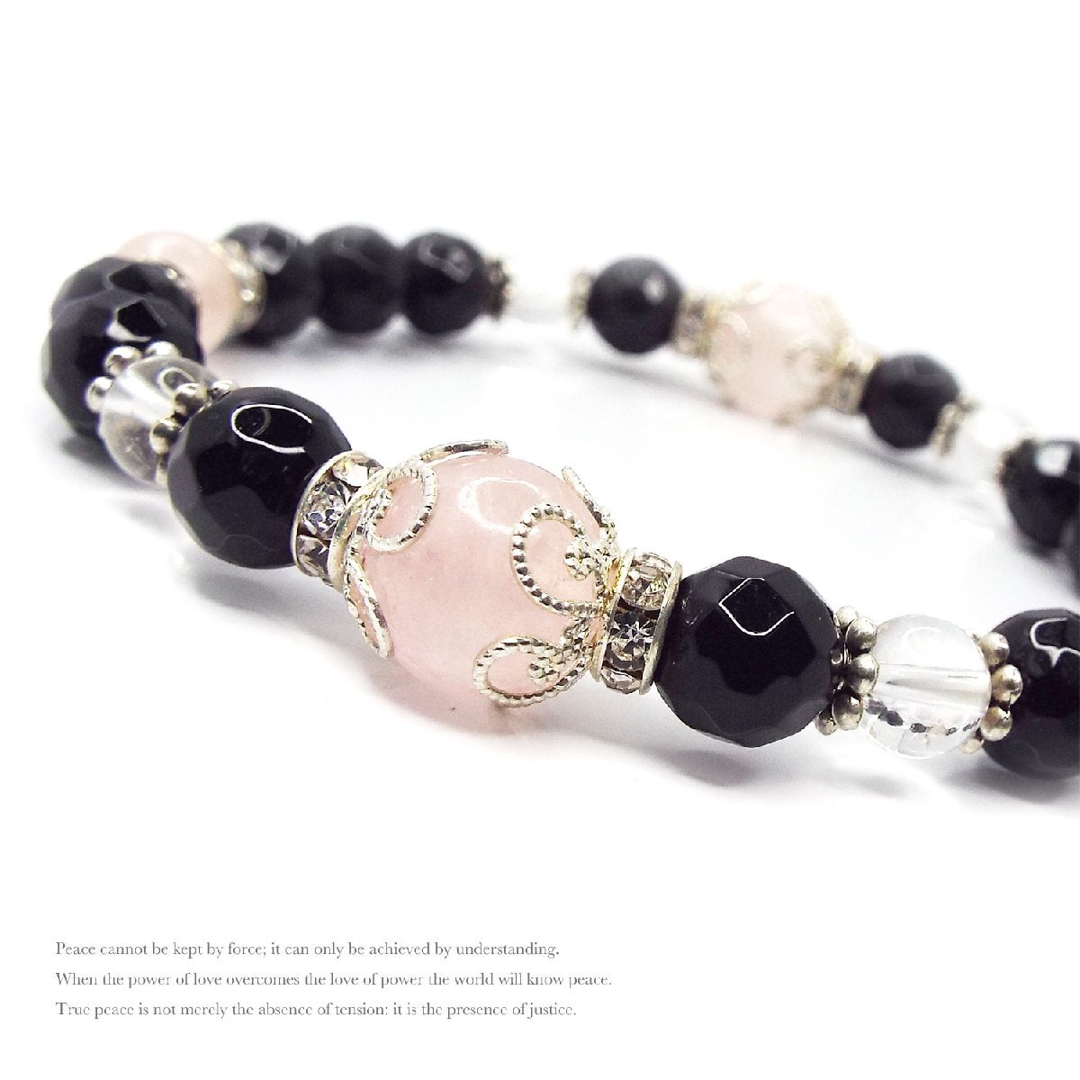 | 【STONE KITCHEN 天然石 パワーストーン】 やさしく輝くローズクォーツと漆黒の輝きのオニキスを メタルビーズと花座でまとめたキュートでシックなブレスレットができました☆ 相反するような2つのカラーの石を シルバーで上品にまとめおしゃれ感抜群です。 若い女性はもちろん普通のパワーストーンには飽きてきたなぁ…って 思われている方にも新鮮な感じで着けていただけるブレスレットです♪ ローズクォーツは女性なら一つは持っていたいパワーストーンの1つ。 自分を愛する気持ちを大切にし人を愛する気持ちを 高め内面からきれいになれるパワーを与えてくれる石です。 そのローズクォーツにさらにオニキスの心身を安定させるパワーや 目標を達成させるパワーをプラスした頼りになるブレスレットです。 内周:約17cm 玉サイズ:ローズクォーツ 10mm・8mm オニキス 64面カット 8mm 水晶 6mm 1点 注意事項 ※金属部分は汗や汚れ等で変色する場合がございます。気になる場合は 金属磨きや布等で軽くふき取る事をおすすめします。 ※石の種類によっては、艶を引き出すことを目的として、ワックスや着色加工がされているものもあります。 ※表示のサイズは必ずしも最大値・最小値のサイズのものが入っているわけではございません。 ※天然石のため同じものでも色味・模様などが異なります。 ※照明の具合で実際とは色合いが異なる場合がございます。 また、天然素材特有のクラック・内包物を有する場合がございます。予めご了承下さい。 | |