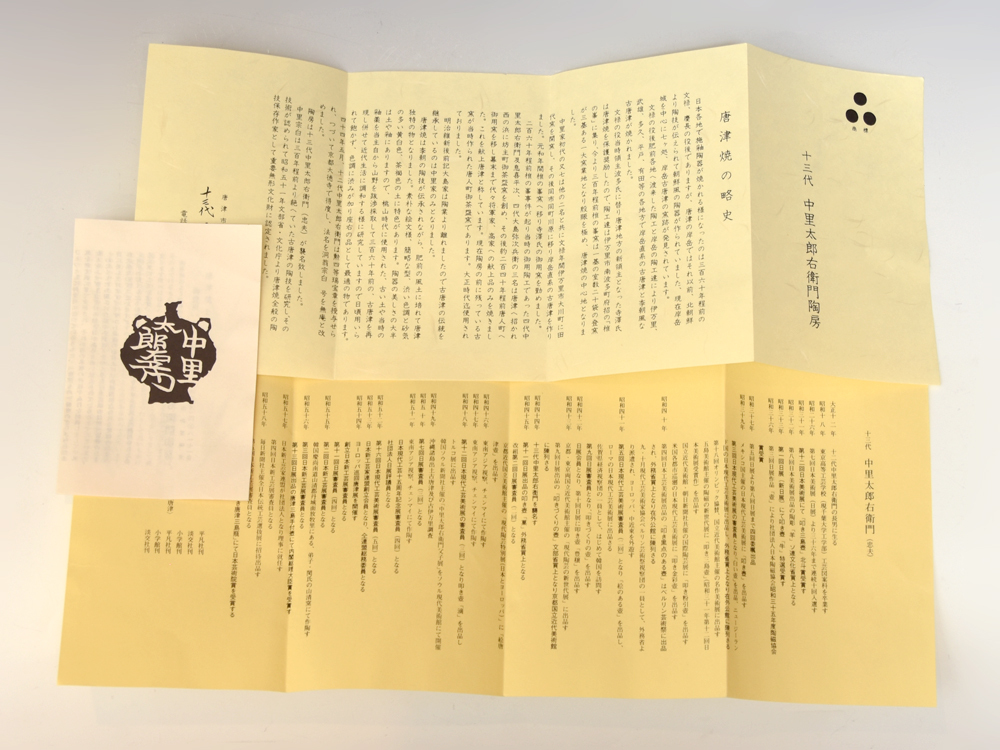 十三代 中里太郎右衛門(1923年 - 2009年) 1943年(昭和18年) 東京高等工芸学校(現千葉大学工学部)工芸図案科卒業 1951年(昭和26年)陶彫「牛」により日展初入選 1965年(昭和40年)現代工芸美術家協会視察団として欧州、中近東視察 1967年(昭和42年)日展会員となる 1969年(昭和44年)13代中里太郎右衛門襲名 1981年(昭和56年)「叩き唐津三島手付壺」により内閣総理大臣賞受賞 1984年(昭和59年)「叩き唐津手付瓶」により日本芸術院賞受賞 1985年(昭和60年)日展理事に就任 1992年(平成4年) 佐賀県重要無形文化財認定 1995年(平成7年) 唐津市政功労賞受賞 同年紺綬褒章受章 1997年(平成9年) 紺綬褒章再受章 2000年(平成12年)日本工匠会(日工会)会長就任 2002年(平成14年)長男・忠寛に名跡を譲り、得度して逢庵と号する 2007年(平成19年)12月、日本芸術院会員となる 2008年(平成20年)旭日中綬章を受ける 2009年(平成21年)3月死去 |