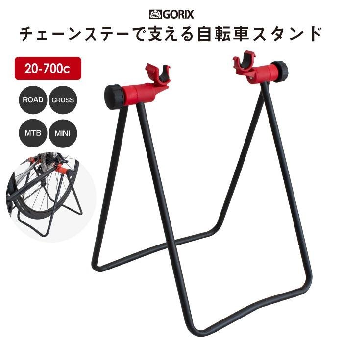 | ロードバイクやマウンテンバイク、クロスバイクなどに最適な自転車1台用スタンド。 スタンドを開いた状態で、上から車体を乗せるだけで取り付けできるチェーンステーで支えるタイプのメンテナンススタンドです。 メンテナンスだけでなく室内展示、室内保管用にご使用頂けます。 メンテナンスの邪魔にならず後輪を浮かせて安定して支えてくれますので 従来のクイックで支えるものより、装着が楽になるスタンドです。 ・ゴムバンドで車体をとめれるのでとても安定します。 ・クイックに挟むスタンドが苦手な方におすすめ。 ・組立も簡単で、使わないときは折りたたむ事可能です。 本体サイズ 材質:アルミ合金 対応:20インチから700Cまで カラー:ブラック、オレンジフック 付属品:フックx2、取付ネジ キズ、汚れがある場合がございます。正常に動作しない場合がございます。ジャンク扱いでお願いします。ノークレーム、ノーリターン | |