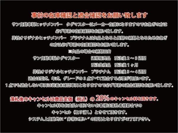 | 【受注生産品】サン自動車製RVR用ヒッチメンバー タグマスターです! ※事前の適合確認をお願い致します※ 取付適合データ ※型式・年式・グレード・その他条件が全て適合する必要があります ■型式:DBA-GA3W ■年式:H22.2~H23.10 ■グレード・注意事項:1.8G 2WD ※その他グレードは装着未確認 ■条件:ノーマル車 ※適合・仕様等は予告なく変更される場合があります ※事前に最新適合情報のご確認をメーカーHP又は質問欄よりお願い致します 商品詳細 ■タイプ:リミテッドII スタイリッシュなステンレスモデル ※サイドブラケットはスチール製黒塗装 ■電源ハーネス形状:汎用ハーネス ■牽引クラス(ヒッチメンバー許容荷重):550kg ■品番:TM408410 ■定価:93,500円(税別 85,000円) ■クロスメンバー形状:丸フレームボールマウント脱着式(LTDⅡ) ■穴あけ数:- ※穴あけ数は変更になる場合があります ■加工:牽引フック取外し ※記載が無い場合でも加工が必要になる場合があります ■ボールマウント:上-2 ■付属品:2インチヒッチボール、ボールマウント、スリーブコンセント メス(丸ピン7極 国内トレーラー用)、コンセントプレート、電源ハーネス、クイックディスコネクトピン&Wクリップ、ヒッチボールカバー、取付ボルト類 ※セット内容及び形状は車種により異なります ※スリーブコンセントは多くの種類があります 付属するものは国内で一般的な丸ピン7極です ※連結するトレーラーによってボールマウントの高さが合わない場合があります 合わない場合は別途オプションボールマウントをご購入下さい(専用品には使用できません) ![]() ■適合確認について ご入札前に適合をご確認ください。 ご不明な場合はご入札の前に以下の情報を質問欄、メール、お電話にてご連絡下さい。①~⑤の情報は全て頂かないと適合確認はできません。 ①自動車車種 ②車両型式 ③初年度登録年月 ④車両グレード ※不明の場合は車体番号、型式指定番号、類別区分番号 ⑤改造 マフラー交換、エアロ装着(純正含む)、ローダウン・リフトアップ等の状態 ※事前の適合確認連絡が無い場合、ご入札の時点でお客様ご自身で適合確認済みとさせていただきます。 落札後に適合確認のご依頼を頂いた場合、確認は致しますがあくまでもご入札の時点でお客様にて確認済みとさせて頂きます。適合違いによるクレーム・キャンセルはお受けできません。 ■在庫確認について ヒッチメンバーはメーカー在庫品になります。 お手数ですが、ご入札前に必ず在庫の確認をお願いします。 質問または直接メールよりお気軽にお尋ねください。 週末をはさむ場合や残り時間が少ない場合は直接メールを頂ければオークション終了後でもご回答ができますのでおすすめいたします。 メーカー在庫は常に変動しているため、在庫の少ない商品は落札のタイミングにより在庫切れになる場合もありますので ご理解の上、ご購入お願いします。 ※事前の在庫確認が無い場合や在庫数が少なくご注文のタイミングでメーカー欠品となってしまった場合のクレーム・キャンセルはお受けできません。 ■発注について メーカー在庫があり、午前11時30分までにご入金頂いている法人様宛てのご注文は当日発注・直送となります。 直送不可の集合住宅宛や個人様宛て、一部法人様(個人宅、集合住宅を事務所としている場合、事務所の接道に4t車が入れない等、個人宅様送料となります)などは弊社へ一度入荷致します。メーカー在庫があっても発送まで2~3日かかります。 午前11時30分以降のご入金分は翌日の発注となります。 金曜日午前11時30分以降のご入金分は翌週営業日の発注です。 土日祝日はメーカー定休日となります。発注・発送はできません。 店舗引取りはメーカー在庫があり、締め時間(午前11時30分 ※土日祝日除く)に間に合えば翌々日17時頃にご用意となります。 ■お問い合わせについて 土日祝日の適合・在庫、納期及び取付けに関する質問の回答は翌週営業日になります。 メーカーHP 管理番号ST0089TM408410MITSUBISHI |
