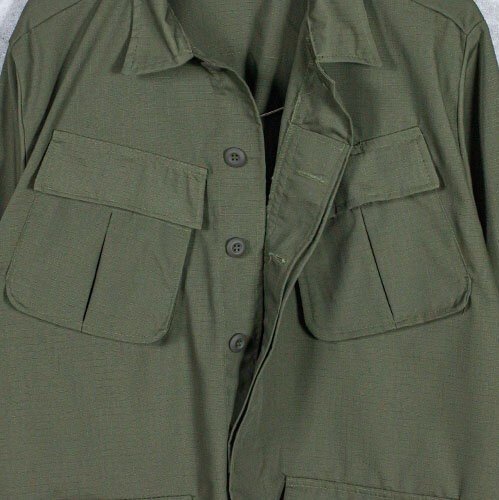 1962年に採用されたジャングルファティーグの歴史は長く、大きく分けて4度の改良を経ています。当時、開発に当たりM42パラトルーパージャケット、パンツが参考にされており、ジャケットは4個、パンツは6個のポケットを持つスタイルでした。特徴のある斜めに配置された胸ポケットは、戦闘で体を伏せた場合に物を取り出しやすいように工夫されました。また、ポプリン生地は従来のコットン生地より軽量で速乾性に優れていました。 ジャングルファティーグは、当初採用されていた露出されたボタンやエポレットは廃止され、ポプリン生地は鉤裂き防止加工が施されたリップストップ生地に変更されました。実戦のなかで改良が加えられ、完成度の高くなったジャングルファティーグは後のBDUに大きな影響を与え、4ポケットジャケット、6ポケットパンツのスタイルは、1990年代末まで戦闘服の基本形となりました。