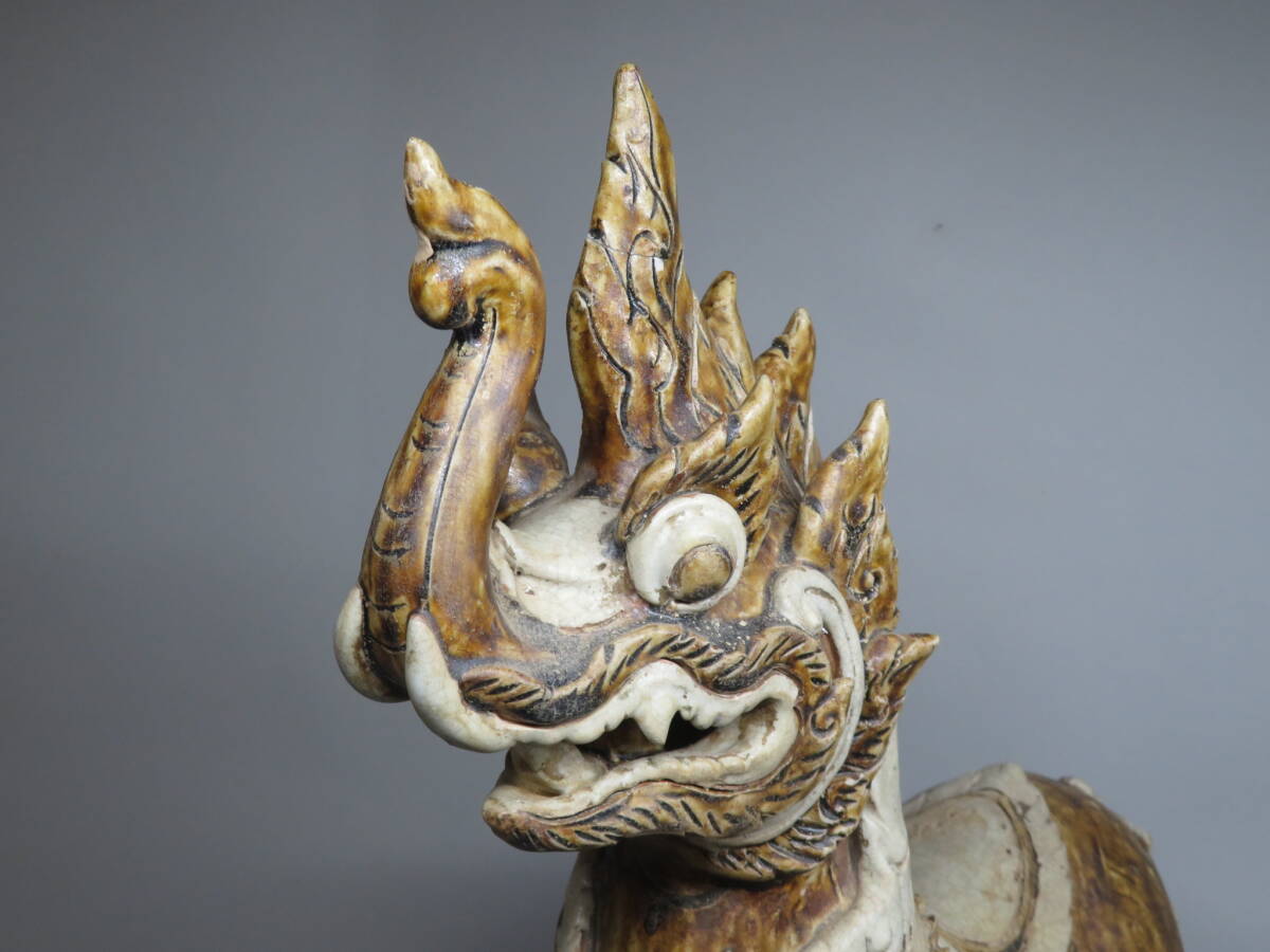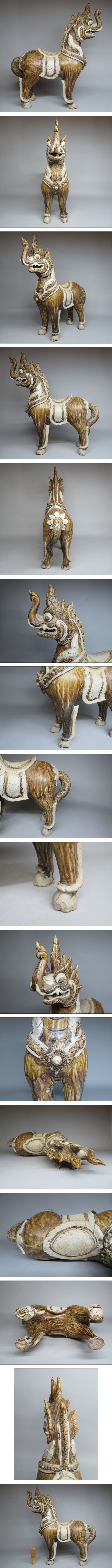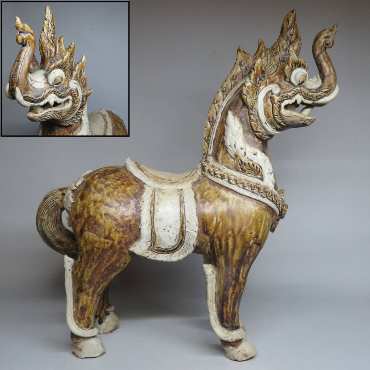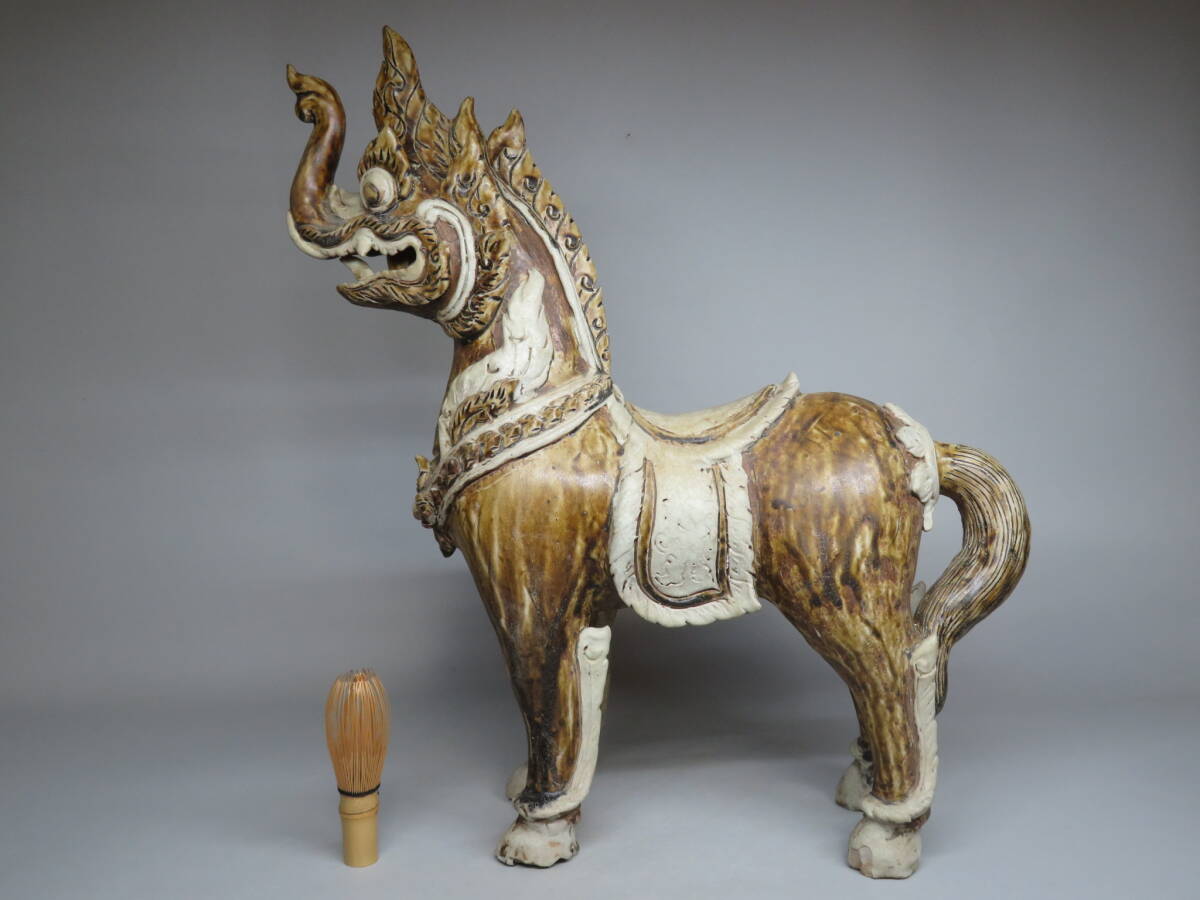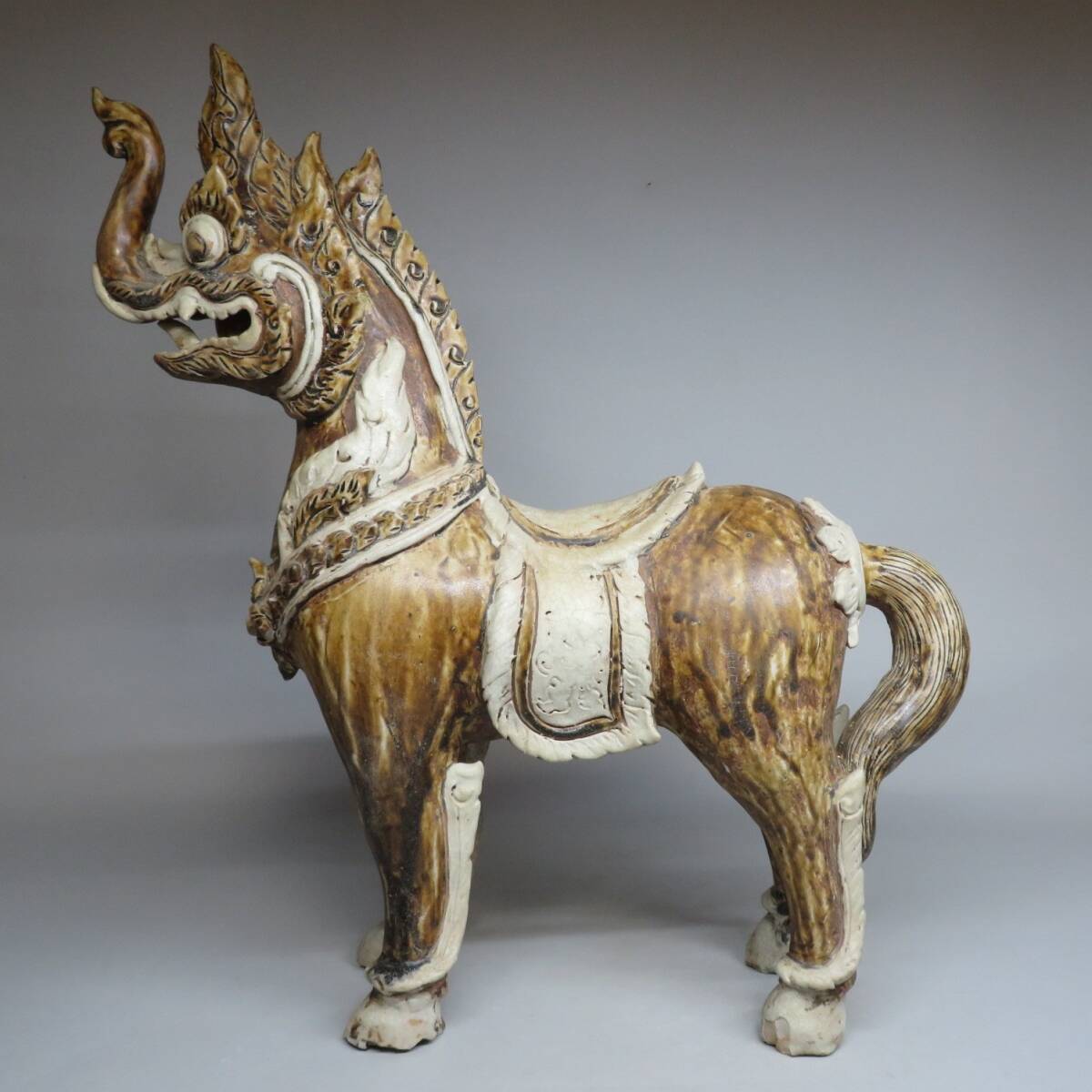 | 「都内コレクター所蔵品」タイ古陶磁 スコータイ時代 陶器製 白濁褐釉 ノラシンガ像 置物 スワンカローク◆発掘品 | |||