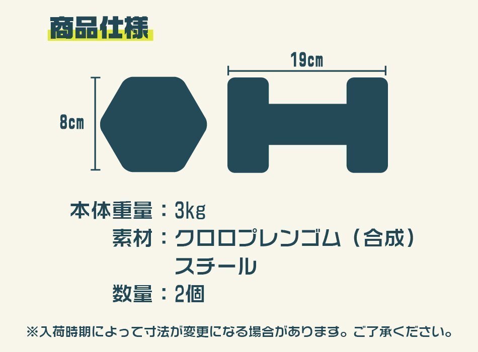 | フィットネスから筋力トレーニングなど、様々なエクササイズに最適なダンベルです。 クロロプレンゴム仕様で握りやすい! コンパクトなサイズ、明るくポップなカラーデザインになっているので、女性にオススメなアイテムです。 【商品仕様】 カラー:ハニー サイズ(約):幅19cm×高さ8cm 重量(約):3kg(1個) 材質:クロロプレンゴム(合成ゴム)、スチール 【商品内容】 カラーダンベル 3kg ×2個 ※重量の表記は目安となります。若干の誤差が出る場合がありますのでご了承ください。 ※ダンベルを引きずるなど、接触・摩擦によって他製品へ色移りする可能性がありますのでご注意ください。 |