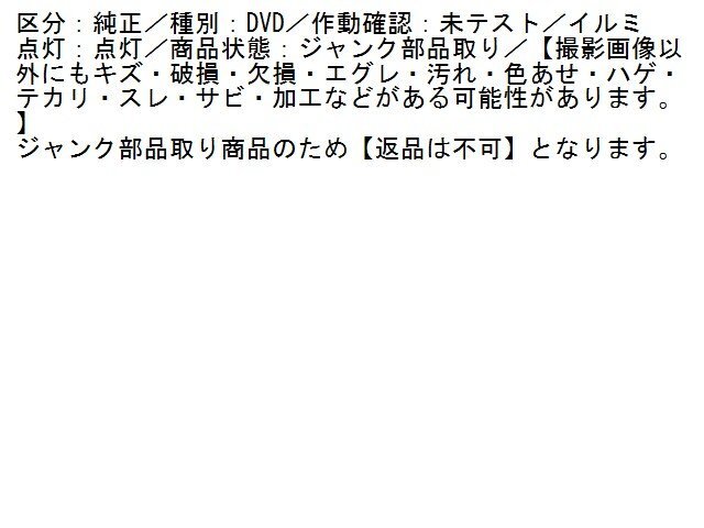 | 商品情報 | 区分:純正/種別:DVD/作動確認:未テスト/イルミ点灯:点灯/商品状態:ジャンク部品取り/【撮影画像以外にもキズ・破損・欠損・エグレ・汚れ・色あせ・ハゲ・テカリ・スレ・サビ・加工などがある可能性があります。】 | ||