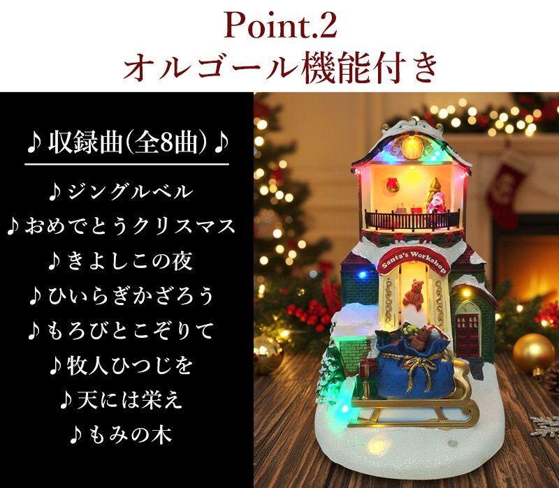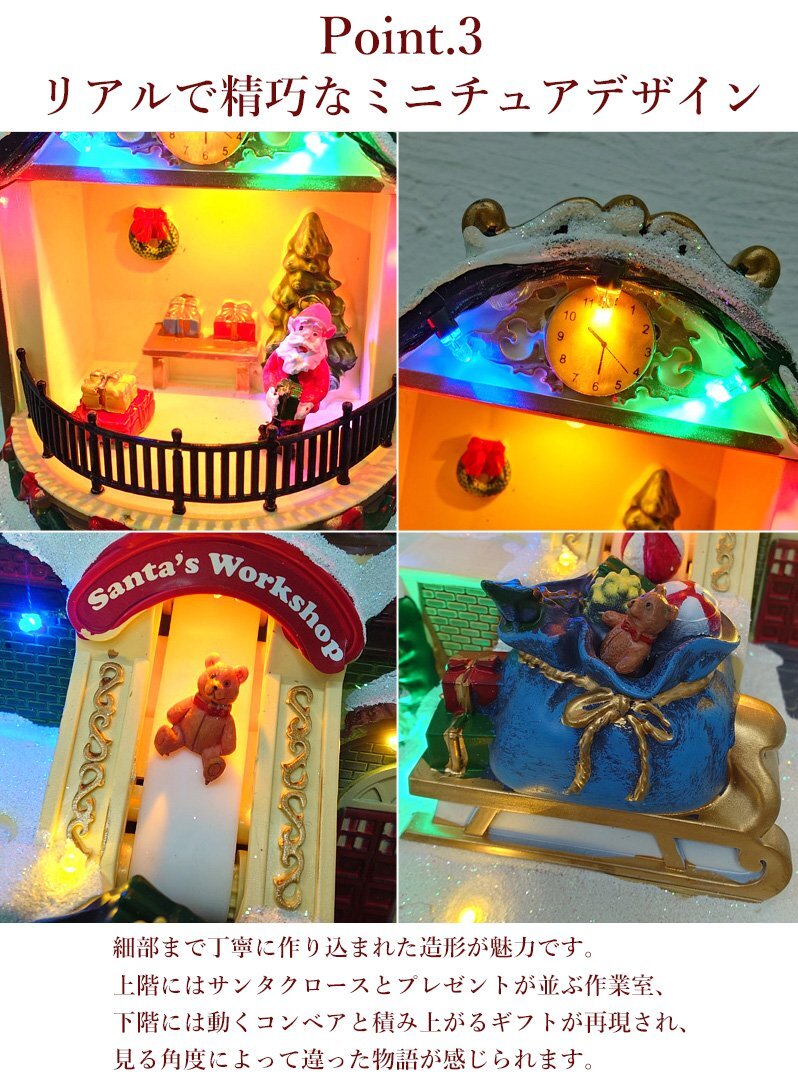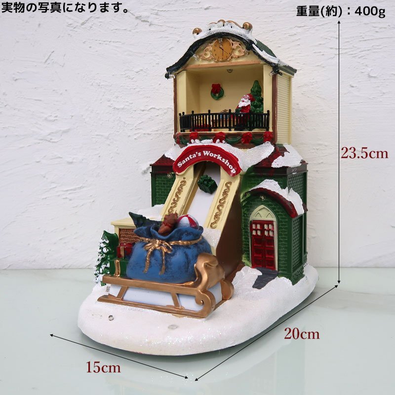 ![]() サンタの工房が動き出す!LED&メロディ付きクリスマスオブジェ まるで本物のサンタの作業場をミニチュアで再現した、温もりあふれるクリスマスオブジェです。 電源を入れると、幻想的にLEDライトが点灯し、クリスマスソングが流れ始めます。 中央のコンベアが動いてプレゼントが運ばれるギミック付きで、見ているだけでワクワクが止まりません。 リビングや玄関に飾れば、クリスマスムードが一気に高まる存在感。 夜はライトアップがやさしく灯り、心を温めてくれます。 細部まで丁寧に作り込まれた造形が魅力です。 屋根の雪や壁のレンガ模様、木の扉など、まるで北欧のサンタ村から切り取ったような温かみあるデザイン。 上階にはサンタクロースとプレゼントが並ぶ作業室、下階には動くコンベアと積み上がるギフトが再現され、見る角度によって違った物語が感じられます。 小さなパーツ一つひとつに彩りと質感のこだわりが詰まっており、まさに“動くミニチュアの世界”を楽しめる一品です。 給電方法は2つ、付属のUSBコードで使用する他、 単三電池3本でコードレスとしての使用も可能! 精巧に作られている為、ライトを点灯させずに 単体でオブジェとして使用しても存在感抜群です! ギフトなどにもおすすめです! ●動作パターン● ・未点灯 ・LED点灯(音楽なし) ・LED点灯(音楽あり) ※乾電池、USB出力用のアダプターは付属しておりません。 点灯時の様子は動画でご覧くださいませ。 動画はこちら ↓↓↓↓↓↓↓↓↓↓↓↓↓ こちらをクリック! サイズ(約): 横幅15cm×高さ23.5cm×奥行20cm コード長さ(約):185cm 重量(約):400g 素材:プラスチック・樹脂 【給電方法】 単三電池×3/USBコード |