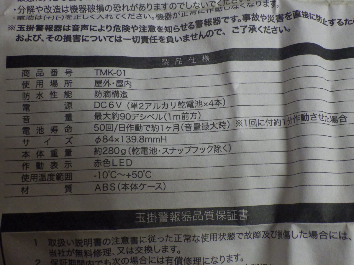 | ■商品説明■■■ ユニット 玉掛警報機 TMK-01 ・電源:DC6V(単2アルカリ/乾電池×4本) ※電池は付属しません。 ・音量:最大約90デジベル(1m前方) ・サイズ:Φ84×139.8mmH ・本体:約280g(電池・スナップフック除く) ■未使用品?かと思われますが、長期在庫商品となります。ご理解の上ご検討下さい。 ■電池を入れて、音のみ確認しています。本体に電池は付属しません。ご落札者様でご手配下さい。 ■実際のテストは行っておりません。ご了承下さい。 ■商品の状態等必ず画像でご判断下さい。現状渡しとなります。 ■上記、ご理解の上ご検討下さい。 ■気になる点がある方は、ご入札前にご質問欄からお気軽にどうぞ!! ※3相200Vの商品に関しましては、モーター等の回転方向をご確認の上、ご使用下さい。回転方向が逆の場合、正常に作動しない場合がございます。 ご落札者様は、自己責任の上、 ご使用の前に充分に安全をご確認下さい※ ■発送方法■■■ 【静岡県静岡市発送】 ■お引き取り ■佐川急便:SSサイズ