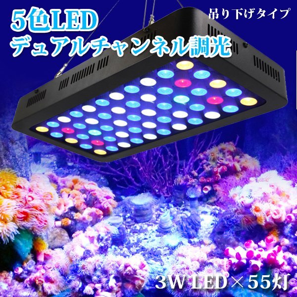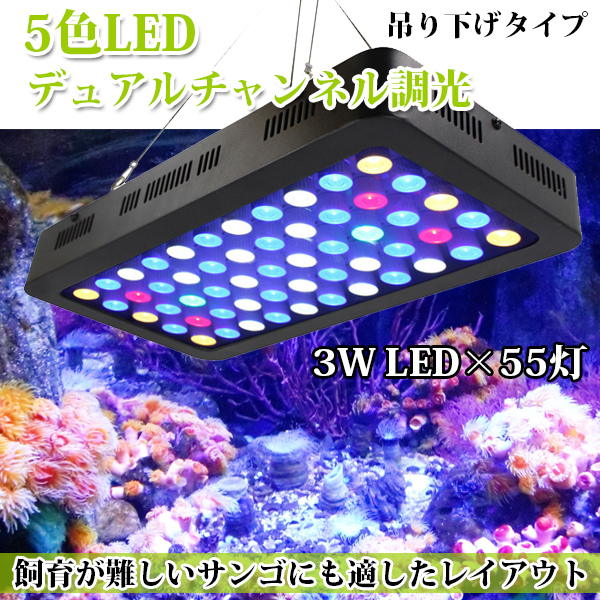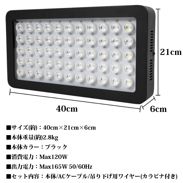 | 十分な光スペクトルと超光透過性を備えた55個のLEDにより、水槽内の植物、サンゴが快適な環境で成長します。 2個の独立チャンネルによりお好みのカラー、明るさに調節可能。 背面3個のファンで効果的に放熱。 調節可能吊下げワイヤー 【チャンネル1】27LED ■ローヤルブルー(450nm):21LED ■ブルー(470nm):6LED 【チャンネル2】28LED ■白色(7500K):4LED ■暖色(3500K) :8LED ■スーパーレッド(660nm) :2LED ■シアン(495nm):2LED ■紫(420nm):6LED ■UV:6LED ≪製品情報≫ ■本体重量(約)2.8kg ■本体カラー:ブラック ■消費電力:Max120W ■出力電力:Max165W 50/60Hz ■セット内容:本体/ACケーブル/吊り下げ用ワイヤー(カラビナ付き) | ||
