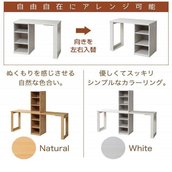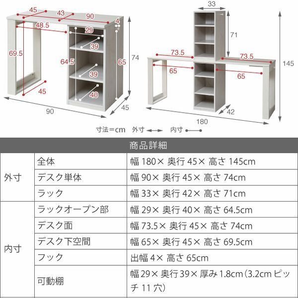 【カラー】 ナチュラル、ホワイト 【サイズ】 <外寸> 全体:幅180×奥行45×高さ145cm デスク単体:幅90×奥行45×高さ74cm ラック:幅33×奥行42×高さ71cm <内寸> ラックオープン部:幅29×奥行40×高さ64.5cm デスク面:幅73.5×奥行45×高さ74cm デスク下空間:幅65×奥行45×高さ69.5cm フック:出幅4×高さ65cm 可動棚:幅29×奥行39×厚み1.8cm(3.2cmピッチ11穴) 【材質】 本体:プリント紙化粧合板 天板:合成樹脂化粧合板(PVC) 【耐荷重】 デスク面:30kg以下 可動棚:8kg以下 【生産国】 中国 【梱包】2梱包でお届けします。 2-1 サイズ:96×49×13cm、重量:19.3kg 2-2 サイズ:96×49×13cm、重量:19.3kg 【その他】 ・可動棚:4枚 ・フック:4個 ・背面化粧有り 【組み立て品】 お客様による組み立てが必要です。 【ご注意】 ・サイズ、重量は概算です。 ・商品カラーはご使用のモニターによって実際の明るさや色と異なって見える場合がございます。 |