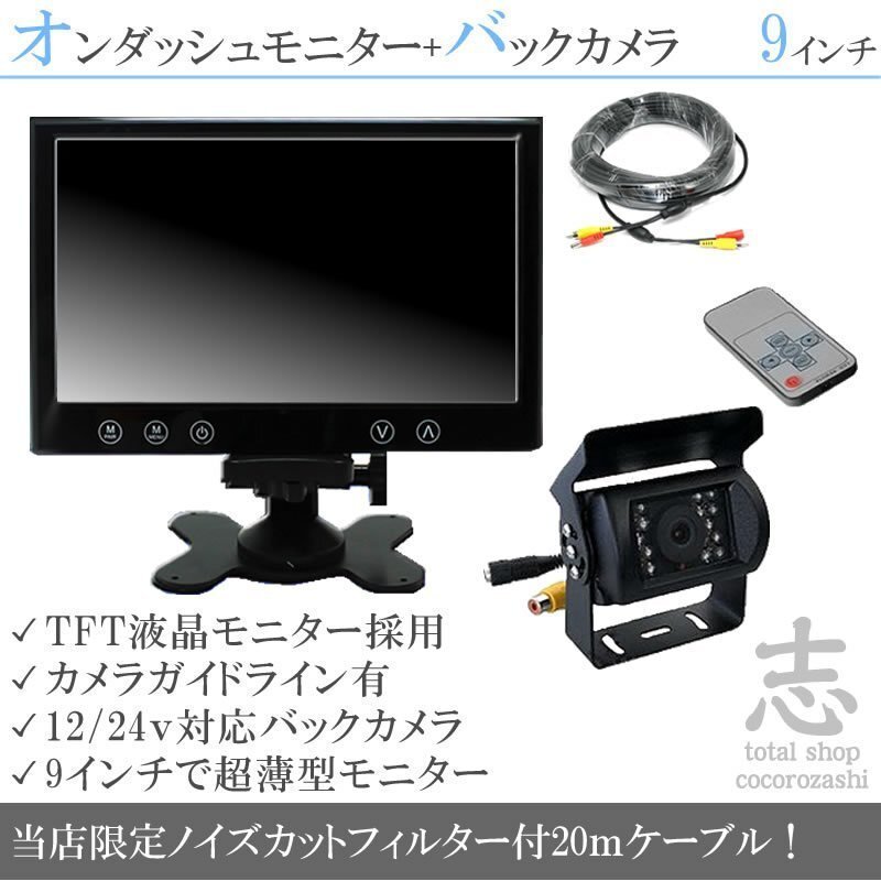 | ■24V車対応の液晶モニター + バックカメラセット 液晶モニターとバックカメラのセットなので、こちらのセットだけで バックカメラをご利用出来ます。 ■9インチオンダッシュ液晶モニター 9インチTFT液晶なので、バックカメラ用としては、満足出来る大きさです。 また、オンダッシュタイプのため、取り付け場所を選ぶことが出来ます。 ■赤外線LED搭載バックカメラ 赤外線LED搭載モデルのため、視認性が低下し易い夜間でも一定の視認性を確保出来ます。 また、広角カメラなので視認性も高く、より確実な確認が出来ます。 ■ノイズカットフィルター付き 付属のケーブルにノイズカットフィルターを装着した状態でお届けします。 ※ノイズカットを100%行なうものではございません。 |