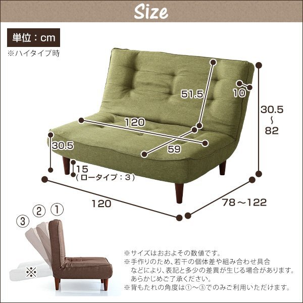 | 【カラー】 ブラウン、グリーン、グレー、ネイビー、ターコイスブルー 【サイズ】 外寸:幅120x奥行き78~122x高さ30.5~82cm 座面高:30.5cm 脚の高さ:15cm 【重量】 16kg 【素材】 構造材:スチールパイプ クッション材:ウレタン(モールド成型)、ポケットコイルスプリング 脚部:ポリプロピレン 生地:ポリエステル100% 【梱包】 サイズ:120x120x20cm、重量:18kg 【完成品】 脚のみお客様取り付けになります。 【ご注意】 ・サイズ、重量は概算です。 ・商品カラーはご使用のモニターによって実際の明るさや色と異なって見える場合がございます。 |