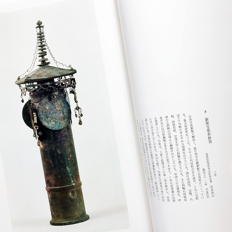 筒身は鋳銅製で細長く、蓋の部分を鍛銅板で宝塔形につくっている。蓋は覆鉢形につくり、その上に円筒形の首を設け、これに宝形造りで勾配のゆるやかな屋根をかけている。頂には請花、宝瓶、九輪、四葉花座、宝珠を付した相輪を建てている。また相輪の四葉花座から隅棟の雲珠とに銅線をわたしている。軒回りには瓔珞を、軒裏中央には円形銅板とをそれぞれ垂下させて、これに法華経の品題を墨書している。筒身は、上縁と底部近くに各一帯を鋳出し、底部には二段の造り出しがある。底は入底で、佝面には経巻の残片が付着している。筒身の表面には総体に墨書銘があり、保安四年(一一二三)三月十七日、勘進僧云云などわずかに読み得るのみである。