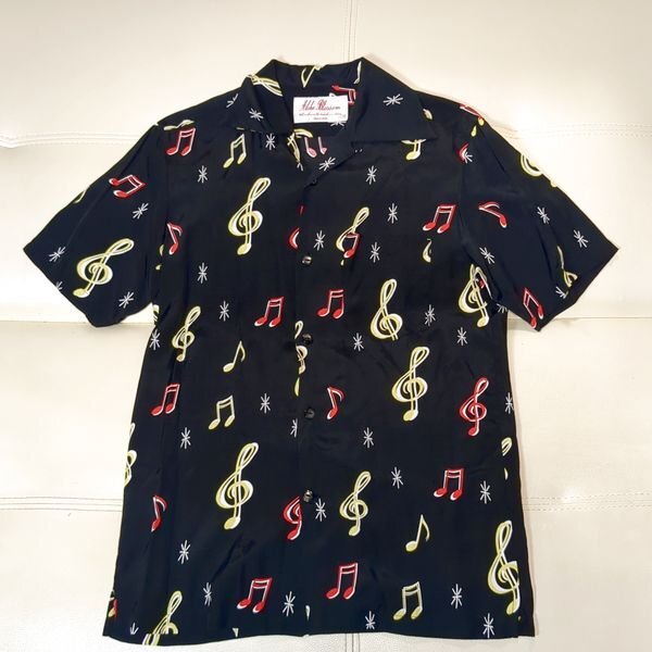 【アロハブロッサム 音符柄 アロハシャツ 38 レーヨン aloha blossom SOUNDS GOOD BLACK 日本製】