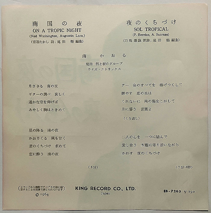 | 和モノ歌謡ハワイアン南かおるEP盤『南国の夜ON A TROPIC NIGHT/夜のくちづけSOL TROPICAL』(キングレコードEB-7263) 1964年 レコード1枚 ハワイアン音楽の定番曲の日本語カバー 再生確認はしていません。 盤面に「よごれ・キズ」があります。 正常な再生の保証はできませんので「ジャンク品扱い」での出品です。 実物の撮影ですが、画像より実物の方が、ジャケット&内袋「よごれ・シミ・シワ・縁イタミ・レコードあと」が目立ちます。 「ジャンク品」(音飛び・ノイズ)でも構わないという方のみ、入札をお願い致します。 画像以外に付属するものはありません。 | |||
