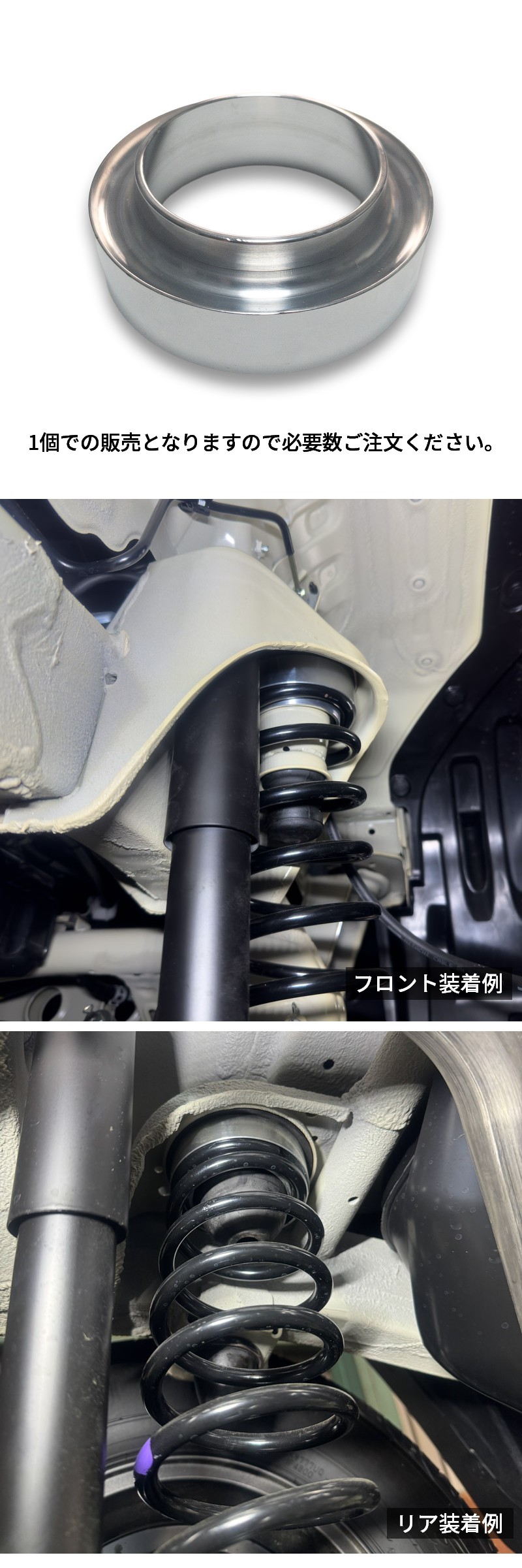 | 商品説明 | 【リフトアップキットの単品パーツ販売ページとなっております】 単品パーツのみでリフトアップすることはできませんのでご注意ください。 純正コイルスプリングの上部に取り付けしてリフトアップが可能です。 フロント、リア共通となりますので、前後の車高の調整にも使用可能です。 1個での販売となりますので、必要数ご注文ください。 【商品内容】 ・リフトアップ用アルミコイルスペーサー【20mm】 1個 【ご注意】 コイルスペーサーでリフトアップをした場合、 リアショック延長ブラケット、左リアロングブレーキホースの変更が必要です。 別途購入可能です。 ※リフトアップキットとして コイルスペーサー、リアショック延長ブラケット、左リアロングブレーキホースの セット販売も行っております。 ※純正LEDヘッドライトのジムニー【XC】/ジムニーシエラ【JC】グレードは 別途、車高センサー補正ステーが必要となります。 |