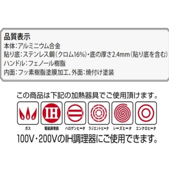 | 素材・材質 | 本体:アルミニウム合金、貼り底:ステンレス鋼(クロム16%)、ハンドル:フェノール樹脂 |