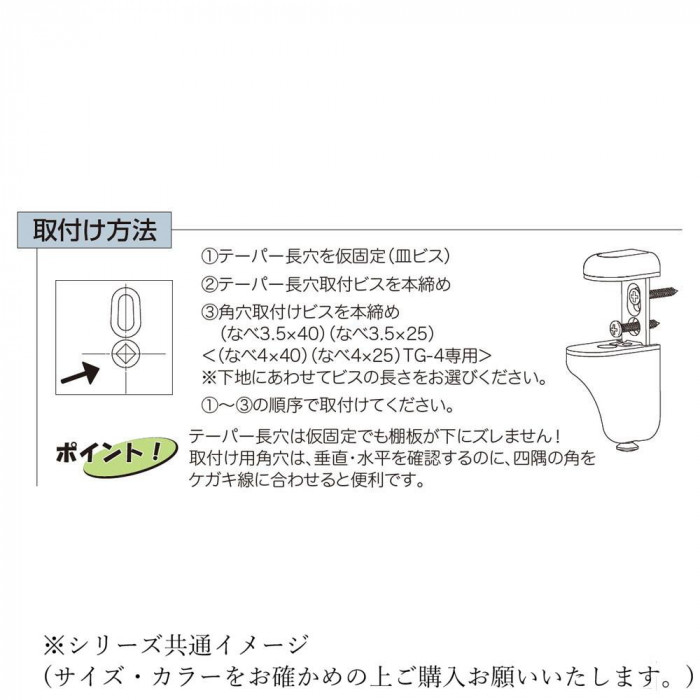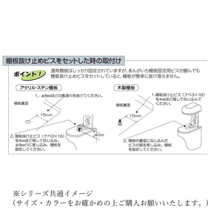 | 仕様 | 対応板厚:2~28mm 最大棚板奥行:250mm 最大取付間隔:455mm 耐荷重(最大取付間隔2箇所止):20kg |