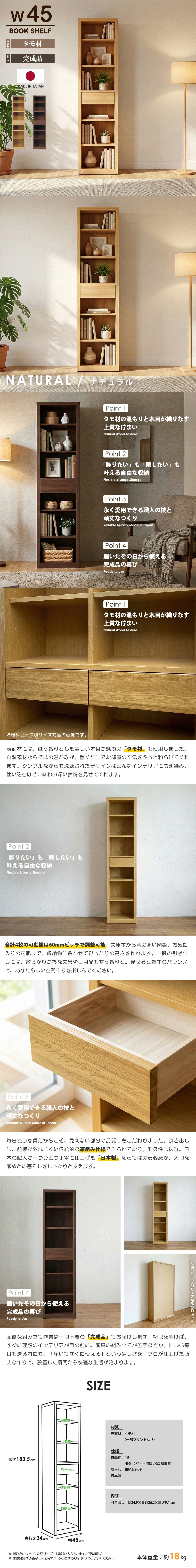 | 特 徴 | タモ材の美しい木目が空間に温かみを添える、日本製のフリーボード。 幅45cmのスリム設計で、本棚としてはもちろん、お気に入りのコレクションを飾るディスプレイラックとしても活躍します。小物整理に便利な引き出しも備え、見せる収納と隠す収納を両立させました。 | | 商品サイズ | 本体:幅45×奥行34×高さ183.5cm 引き出し内寸:幅34.9×奥行26.2×高さ9.1cm