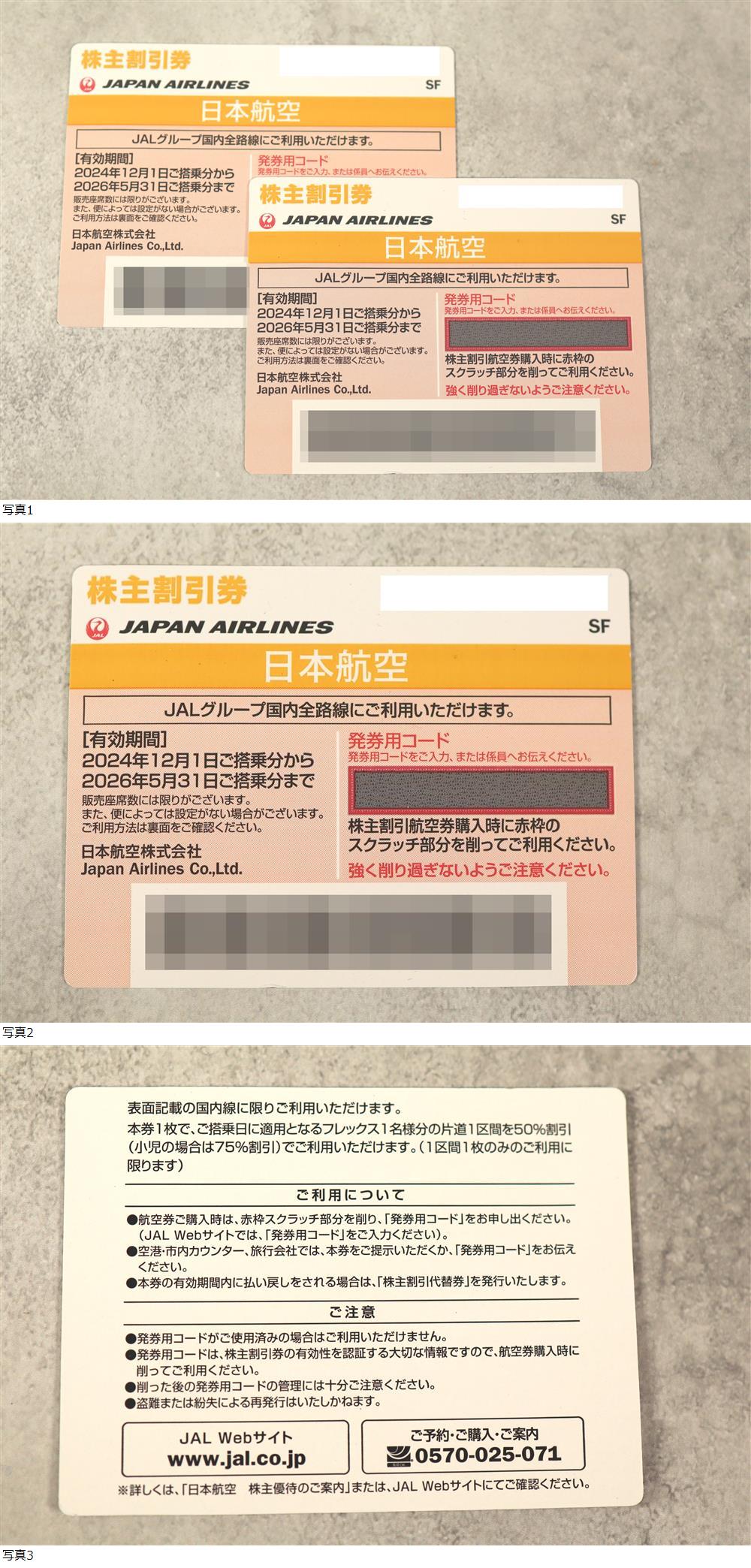 JAL 日本航空 株主割引券 2枚 株主優待 優待券 割引券 有効期間 2026年5月31日 ご搭乗分まで 日本航空株式会社の出品です。 ★配送方法 :レターパックライト にて発送いたします。番号通知のみ(送料無料)も可能です。 ★完品をお求めの方は入札をご遠慮ください。 ★入金確認後、3日以内に発送いたします。 ★写真には写しきれない小キズやスレ等あるものとお考え下さい。 ★ご使用のモニター設定により色味が異なる場合があります。 ★ノークレーム・ノーリターンでお願いします。 ★ご入札後3日以内に決済を完了出来る方のみご入札下さい。