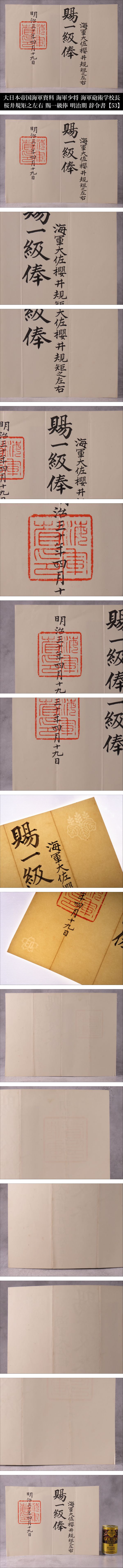 | Lot.20260423HA251129OSX/10 ※ご入札いただいた時点で下記記載事項全てにご了承いただいたものとさせていただきます。 ※商品タイトルは当方判断に基づき記載しております。また単にキーワードとして記載している場合もございますので予めご了承ください。 【ONE'S】大日本帝国海軍資料 海軍少佐 海軍砲術学校長 桜井規矩之左右 賜一級俸 明治期 辞令書 関連資料 明治三十年四月十九日 【53】 桜井 規矩之左右(さくらゐ きくのすけ) 嘉永元年6月6日(1848年7月6日) - 大正元年(1912年11月27日)64歳没 日本の武士、大日本帝国海軍の軍人。海軍兵学校3期。最終階級は海軍少将。 海軍砲術学校長、巡洋艦「比叡」「松島」「千歳」「橋立」の艦長を歴任。 日清戦争において比叡艦長として特に黄海海戦で功績を残しました。 彼の貢献は日本の海軍史において重要な位置を占めています。 《幕末の佐倉藩に生まれ、海軍の礎を築いた「海の侍」。日清戦争・黄海海戦にて、絶望を希望に変えた奇跡の突撃。敵の巨大戦艦に包囲され、沈没か降伏かの絶体絶命の淵に立たされた軍艦「比叡」。その極限状態の中、桜井は「敵陣中央突破」という戦術の常識を超えた決断を下した。炎の中を突き抜けたその一閃は劣勢だった日本海軍を奮い立たせ、日本の運命を変えた伝説の男。》 なかなかお目にかかることのないお品物をこの一期一会のご機会にぜひ。 【商品状態】 掲載画像をご覧下さい。 あくまでも年代物かつ一度人の手に渡っているお品物のため、汚れ、変色、経年による劣化等があるものとお考えいただき、神経質な方のご入札はお控えください。 PC上の画像と商品の色目が若干異なる場合がございます。 説明文に記載のある品物や写真に写っているもの以外は基本的に付属致しておりません。 落札後のトラブルを避ける為にも、説明文および画像をよくご覧になってから、ご入札のほどよろしくお願い致します。 商品状態の記載に関してはあくまでも当方判断基準となっております。 状態等の詳細は写真をご確認いただき購入者各自のご判断にてご入札ください。 | |||