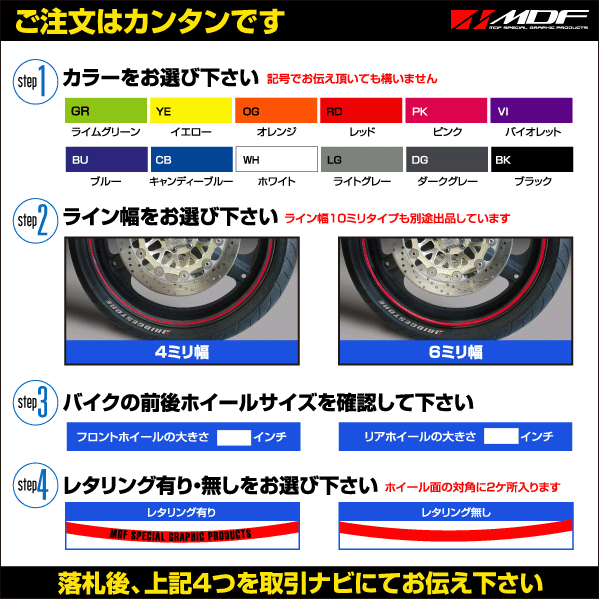 落札後に取引ナビでお届け先とご注文内容をご記入頂く案内をお送り致します。(土日祝日落札の場合は翌営業日のご連絡になります) ご希望のライン幅、カラー、前後ホイールサイズ、レタリングの有無をお知らせ頂きますので、あらかじめ画像2枚目を参照しご希望 内容を書き留めておいてください。 リムストライプゲージを同時に購入したい場合は、【 エムディーエフオフィシャル リムストライプゲージ 】で検索しそちらも落札して まとめて取引をご利用ください。 グラフィックキットなども同時に購入したい場合は、【 エムディーエフオフィシャル 】が出品している商品を落札頂きまとめて取引を ご利用ください。 まとめて取引の詳細はこちらをご覧ください。 |