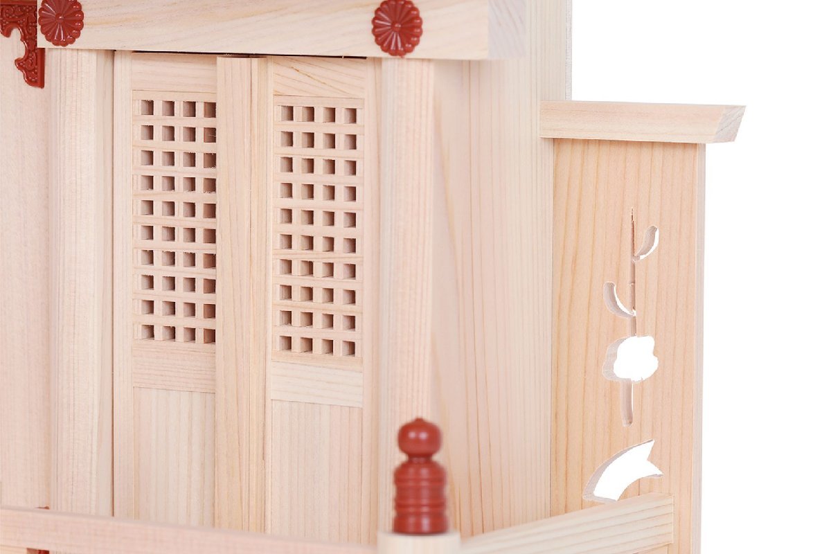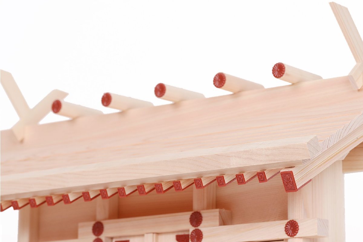 限定台数のみ作成のお社となります 落ち着いた「朱」のパーツを各所に配した、通し屋根タイプの神棚「明け宮」。引き扉は格子戸造り、左右の袖には透かし彫り加工など職人が手間を掛けた繊細で美しい仕上げを施しています。 素材は岐阜県東濃地方、目の詰まった狂いの少ない高級桧材を使用しています。お社の大きさはご家庭や会社・店舗などで設置に悩まない、やや小ぶりの中型サイズ。 神具陶器は愛知の窯元が焼く本格「せともの」、八足台は三重の工房手作り。細微な彫込み神鏡台と合わせて手作りで質の高い、神棚セットをお探しの方に。当店の製品の中でも大変ご好評をいただいております「明け宮」シリーズです。 | |||