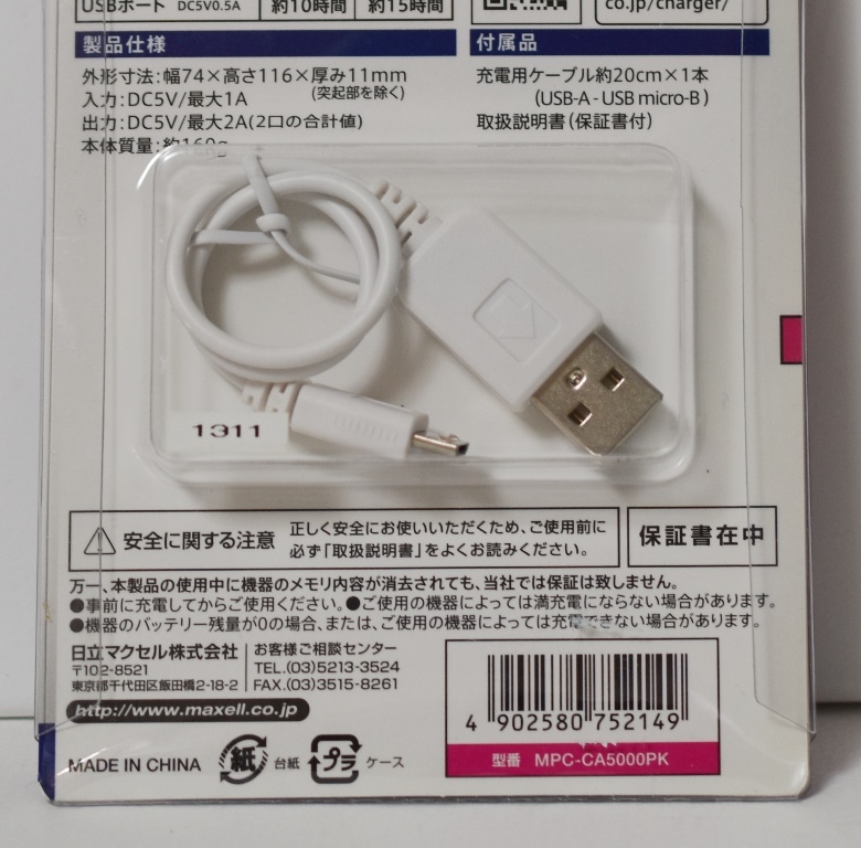 | 【新品未開封品・長期保管品・動作未確認】USBモバイル充電器(マクセル MPC-CA5000PK)※販売終了品 |