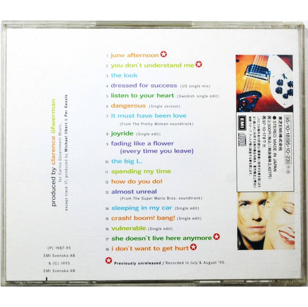 | ご覧いただきありがとうございます。 ■商品説明■ 1. ジューン・アフタヌーン 2. あなたにはわからない 3. ザ・ルック 4. ドレスト・フォー・サクセス 5. リッスン・トゥ・ユア・ハート 6. あぶないお前 7. 愛のぬくもり 8. ふたりのときめき 9. 消えゆく花のように 10. ザ・ビッグ“L” 11. スペンディング・マイ・タイム 12. ハウ・ドゥ・ユー・ドゥ! 13. オールモスト・アンリアル 14. スリーピング・イン・マイ・カー 15. クラッシュ!ブーム!バン! 16. ヴァルナブル 17. シー・ダズント・リヴ・ヒア・エニモア 18. アイ・ドント・ウォント・トゥ・ゲット・ハート コンディション:良い 国内盤 | ||