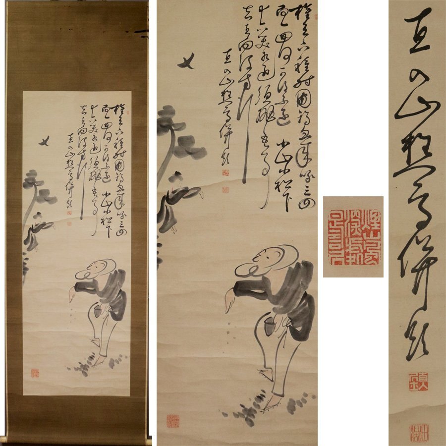 ■商品説明 下記、田能村直入の手により、 のびやかな筆使いにて「権兵衛が種蒔きゃ烏がほじくる」 の例え話の一場面の「種蒔権兵衛図」が描かれた品であり、 上部には、その場景を詠んだ讃句が添えられております。 《 田能村直入 》 旧姓は三宮。本名は癡、字は顧絶。 別号:小虎・山樵・笠翁・画仙堂。 田能村竹田の養子となり、京都府立画学校長などをつとめた 明治時代の南画の大家。 直入という号は自分の直入郡の地名からとったもの。 明治40年(1907年)没。行年94歳。 ■紙本・肉筆 ■状 態 時代なりのヤケ・オレ等あり。 表装の上部に、虫食い跡等の傷みあり。 ■寸 法 軸寸法/約196.0cm×約63.0cm。 本紙寸法/約135.0cm×約47.5cm。 ■落 款 御覧の様な銘・落款等あり。 ■箱 箱。 【即決・送料無料】の表示商品に限り、 一部地域(北海道・沖縄)を除き、送料無料キャンペーンを実施しております。 ご希望の方は、お早めに入札して頂けます様、宜しくお願い致します。 【※※なお、作品に対して疑問や質問がある場合には、※※】 質問欄もしくは、ストア情報に当方の情報が記載されておりますので、こちらをクリックしてお問い合わせ下さい。 宜しくお願い致します。 |