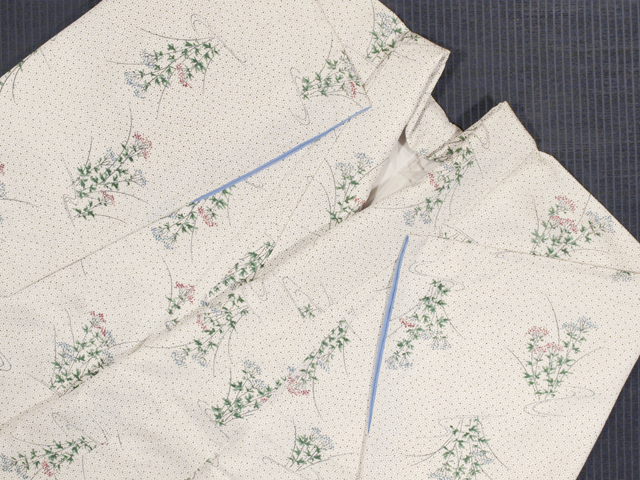 ややきなり色がかった白色の地に、こまかな抽象的な地紋が織り出され、大小あられの地紋と流水、草花の文様が染められている駒綸子の小紋です。袷仕立てです。 さわやかなかわいらしさが感じられる意匠です。ややシャリ感のある手ざわりの駒綸子地です。 ユーズド品です。左前身ごろの身八つ口下直近に直径約 3mm のうすよごれが 1 か所ありますが、柄にもまぎれ、ほとんど判別はつきません。そのほかに目につく大きなしみやよごれ、褪色などのダメージはなく、全体的にはきれいな状態です。 |