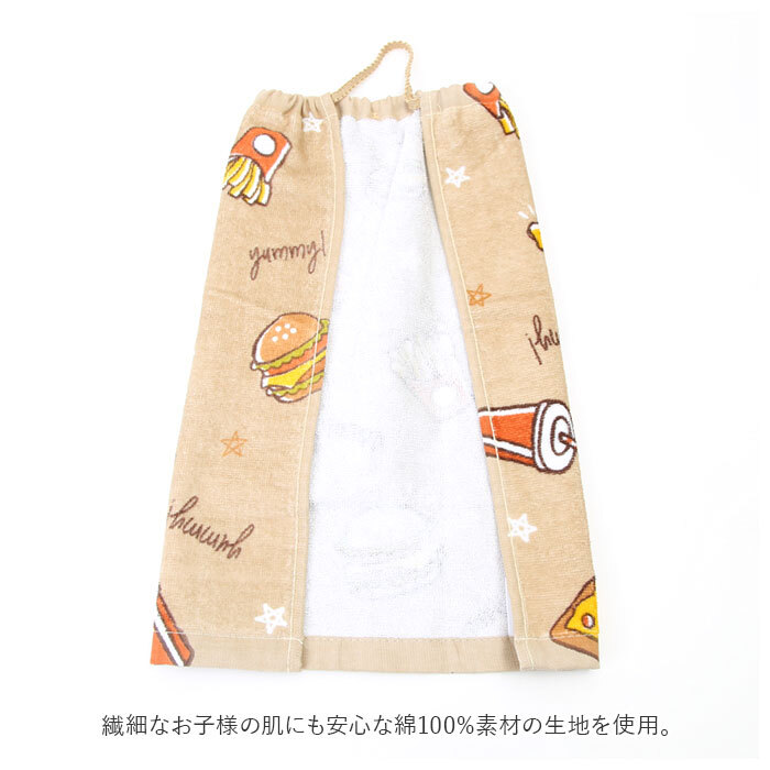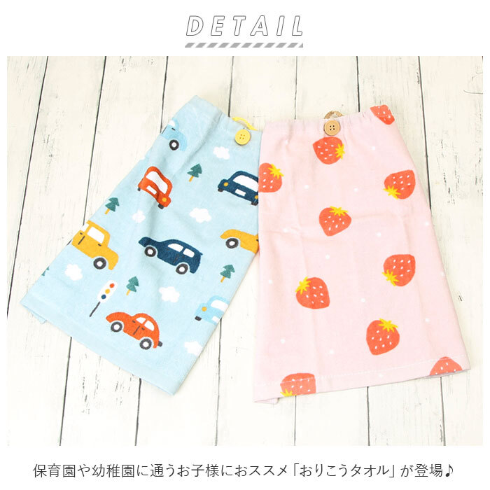| 商品説明 | ・・保育園や幼稚園に通うお子様におススメ「おりこうタオル」が登場♪ ・3WAYで使えるゴムとボタン付きの便利なタオル♪ ・ゴムの部分から被ってお食事エプロンにしたり、フックにゴムを引っ掛けてお手拭きタオル、さらにクルッと小物も包めたりマルチに使えるgoods☆ ・繊細なお子様の肌にも安心な綿100%素材の生地を使用。 ・さらに抗菌防臭機能も付いており、ウイルスや食中毒が心配な時期も安心。 ・名前を書くのに便利なネームタグ付き。 ・ランチタイムや保育時間がより楽しくなる恐竜やアイスクリーム等のカラーバリエーション◎ ・普段の外食やお出かけ、お家でも大活躍なアイテム。 |
