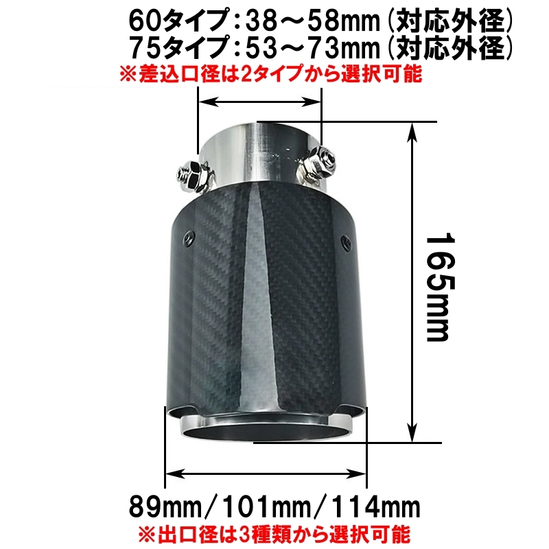 | 商品内容 汎用カーボンマフラーカッター 特徴 ・装着可能マフラー外径(60mmタイプ):38mm~58mm ・装着可能マフラー外径(75mmタイプ):53mm~73mm ・テール径:89mm/101mm/114mm ※全6サイズ ※お客様のお車に合ったサイズをお選びください ・数量:1個(※両サイドマフラーの場合は2点お買い求めください) ・形状:ストレート ・テール:斜めカット ・材質:カーボン(艶あり)/ステレンス 適合確認 ※タイトルにある車種は参考車種になります。 ※タイトルにある車種でも排気量やグレードによって マフラーの外径やリアバンパーの形状が異なります。 必ずマフラーの外径とリアバンパー形状 及び商品の寸法をご確認ください。 取付に関する注意事項 ・専門業者様による取付を推奨しております。 ・火傷防止のためマフラーが冷えた状態で作業してください。 ・脱落防止のため定期的に増し締めしてください。 ・取付、使用に関わるケガ、事故等につきまして 弊社は一切の責任を負いかねます。 |