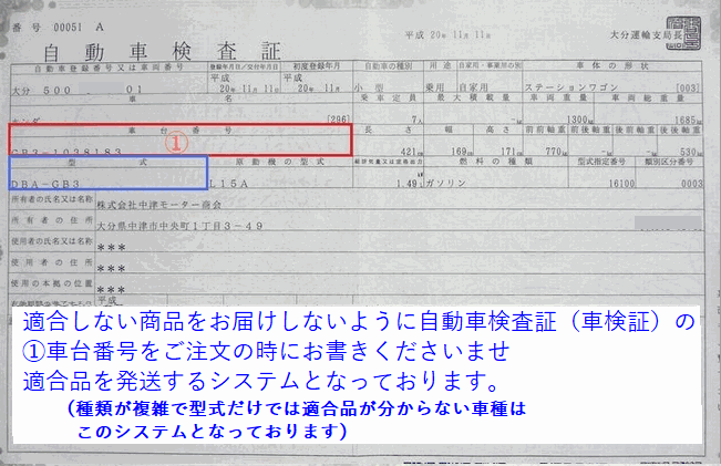 | 【適合品発送システムの説明】 ※ご用意頂いた車台番号は、ご注文の時に【車両情報記入欄】などどこかにお書きくださいませ(ご注文の時に記入し忘れた場合はお問い合わせください) 。 ※適合検索後は適合保障がつきます・・・弊社は100%の適合実績を達成しておりますが、万が一、弊社の検索ミスにより、適合しない場合は往復送料弊社負担にて交換させて頂きます。 ![]() | |