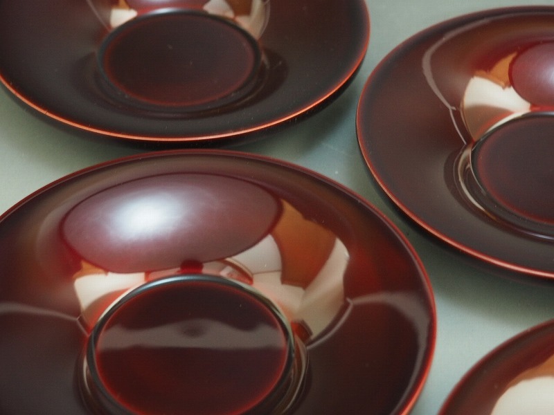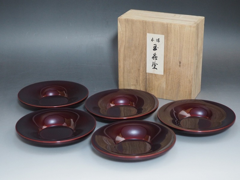 | A4256 本場 玉蟲塗 茶托 5客揃 木箱付 ☆ 煎茶器 煎茶道具 茶器 和食器 漆器 玉虫塗 煎茶托 托子 茶台 茶托 茶托子 納敬 美品 良品 無傷 | ||