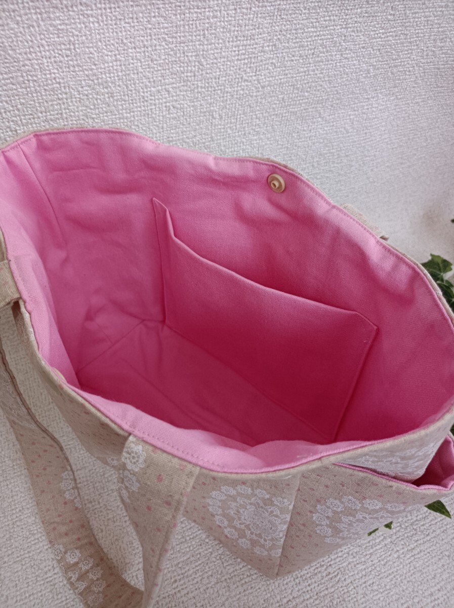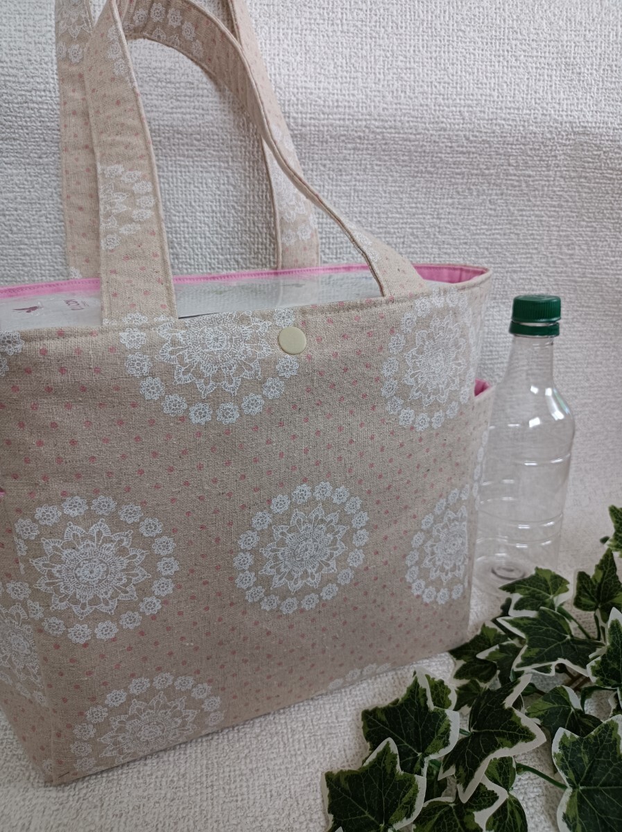 | たくさんの中からご覧頂きありがとうございます。 こちらはサイドポケット付きトートバッグです。 表地はベージュ地にピンクの水玉と白のドイリー柄、内側はピンク サイズ…約 縦24.5cm×横37cmマチ12cm持ち手の長さ54cm 内ポケット1つ縦17cm×横19.5cm 表地は綿麻生地です どのお洋服にも合うお色です。 プラボタン留め 接着芯を貼ってあるので多少張りがあります。 生地に織傷やネップがある場合があります。 箱ティッシュ5箱分くらいが入る大きさです。 500mlのペットボトルも並べて写真に撮っています。 参考になさってください 折りたたんでの発送になります。 丁寧な作業を心掛けていますが至らない箇所も御座います。 神経質な方や完璧な物をお求めの方はご入札をご遠慮下さい。 他にもたくさん出品しております。合わせてご覧くださいませ♪ | |||