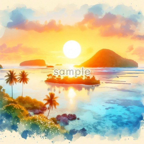| ナウル 世界国景色 緑と夕日と光 水彩 オリジナル絵イラスト 152P Nauru World country scenery green sunset light watercolor Original painting art picture image material |