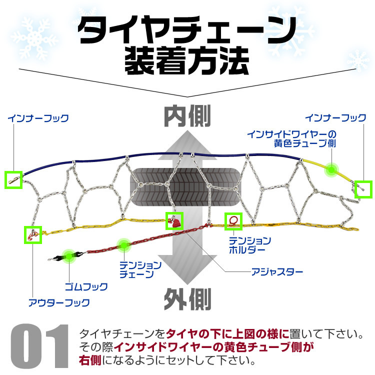 冬の必需品、タイヤチェーンです。 ジャッキアップ不要で取り付けが簡単です! 亀甲タイプで横滑りしにくい! 細い9ミリになってタイヤと車体の隙間が狭い車に適応! コンパクト収納(トランク内でもすっきり収納!) ■商品コード:09MMKNO90 ■適合サイズ 195/75R14 195/80R14 205/70R14 225/60R14 180R15 185R15 195/70R15 205/65R15 215/60R15 225/55R15 195/65R16 205/55R16 205/60R16 215/50R16 225/45R16 205/50R17 215/45R17 235/40R17 205/45R18 215/40R18 235/30R18 ※扁平率が書いてない場合は「80」になります。 ※詳しくは画像の適合一覧表をご参照下さい。 ■内容 タイヤチェーン(1セットは2輪分) 収納袋 取扱説明書 ■注意事項 ・車輌重量2.0t未満の車両にてご使用ください。 ・メーカー・銘柄・夏用タイヤ・冬用タイヤ等で大きさが異なり装着できない場合がございます。 詳しくは販売ディーラーにて確認して下さい。 ・ハンドルをいっぱいに切った状態でタイヤとタイヤハウスおよびタイヤとサスの間隔が3cm以上あることを確認しご使用ください。 ・タイヤ内側と車両の間隔が狭い一部車種・タイヤサイズにてご使用いただけない場合がございます。 (特に車高を下げている場合はご注意下さい) ・タイヤ空気圧が不足している状態での装着はお止め下さい。 ・取付け・取外しは安全は場所で行ってください。 ・増し締めは、必ず行ってください。 ・時速40Km以内でご使用ください。 ・急加速・急減速・急旋回を行わないでください。 ・装着したまま積雪路・凍結路以外を走行しないでください。(タイヤ・チェーン・車両の損傷やスリップの原因となります) ■保障期間 7日間 ※商品到着後7日以内の初期不良・破損のみご対応させていただきます。 【新品未使用品です】 ▼検索ワード タイヤチェーン 緊急用 タイヤすべり止め 金属チェーン 金属タイヤチェーン スノーチェーン スノーレスキュー 金属 亀甲 チェーン 軽トラック 軽バン 自動車 簡単 スノーソック タイヤ滑り止めカバー タイヤ交換 タイヤ チェーン 車 雪道 アイスバーン 凍結 スリップ おすすめ 軽トラック 軽バン 自動車 簡単 スタッドレス タイヤ 交換 カーグッズ スノーチェーン スタッドレスタイヤ 事故 悪路 積雪 タイヤカバー スリップ対策 タイヤ用チェーン カー用品 車用品 |