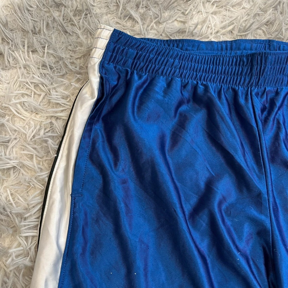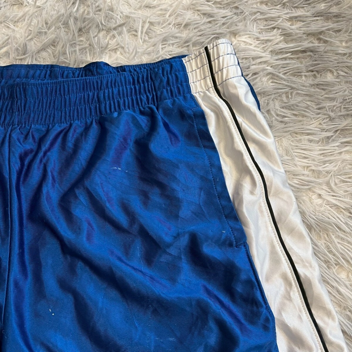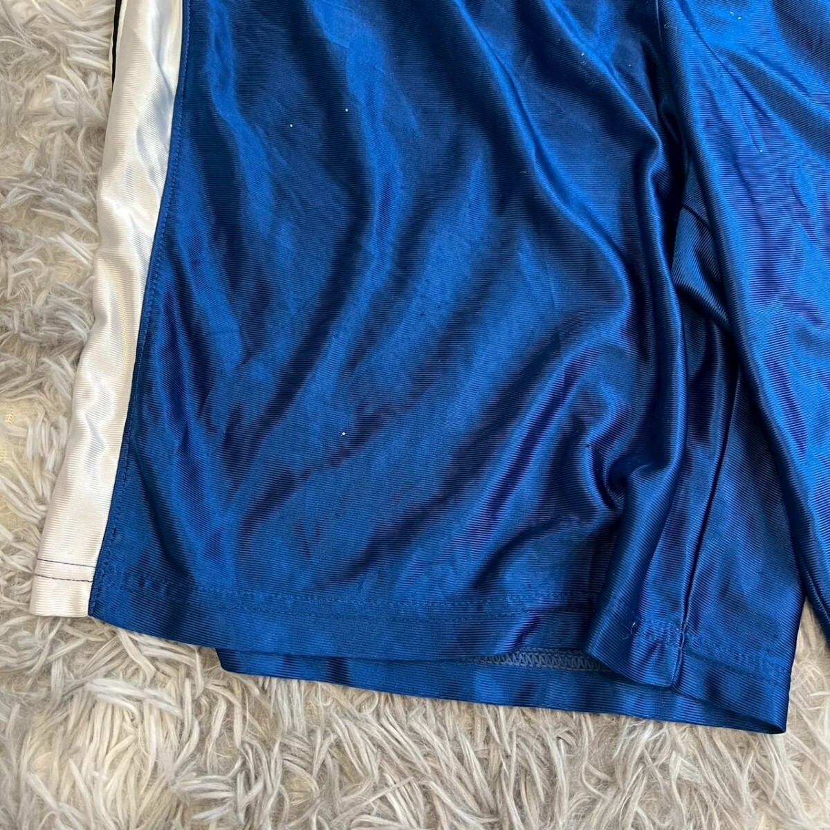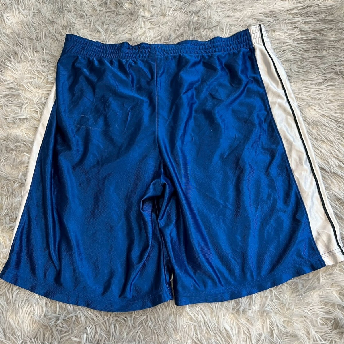 ポリエステル製の青いバスケットボールパンツ、サイドに白いストライプ付き。