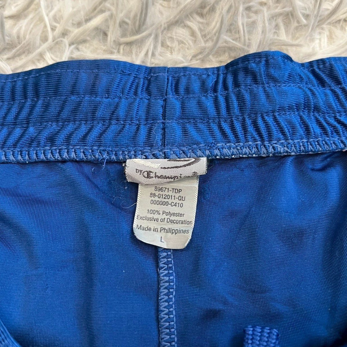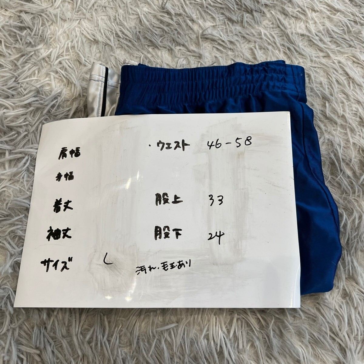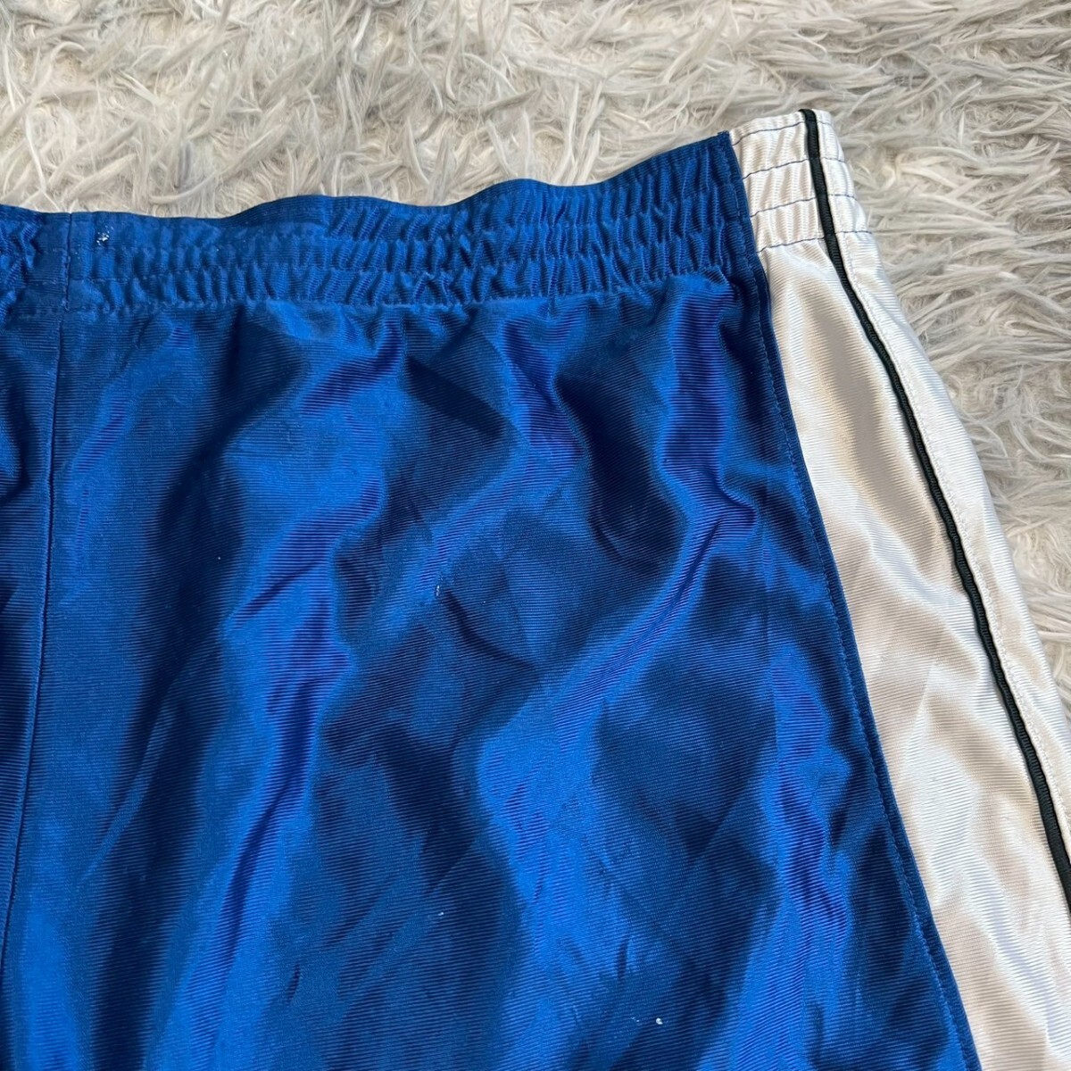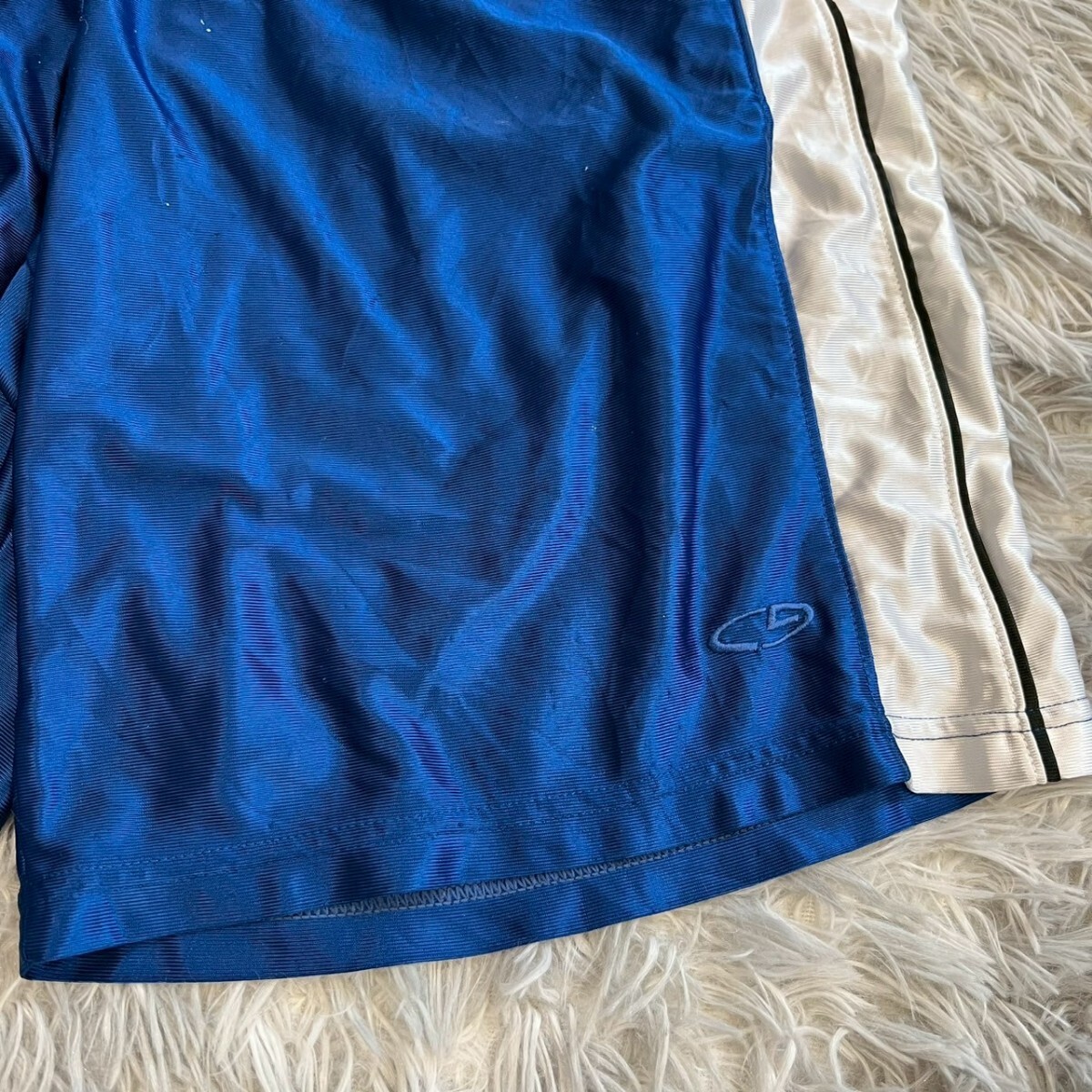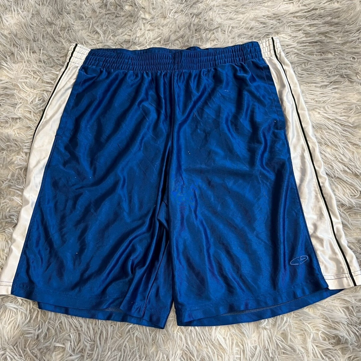 ポリエステル製の青いバスケットボールパンツ、サイドに白いストライプ付き。