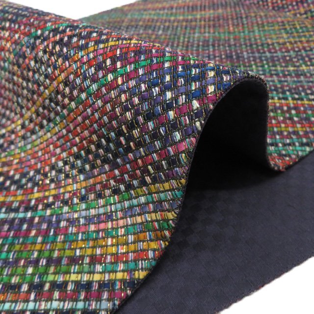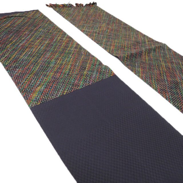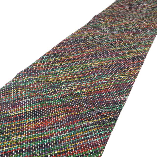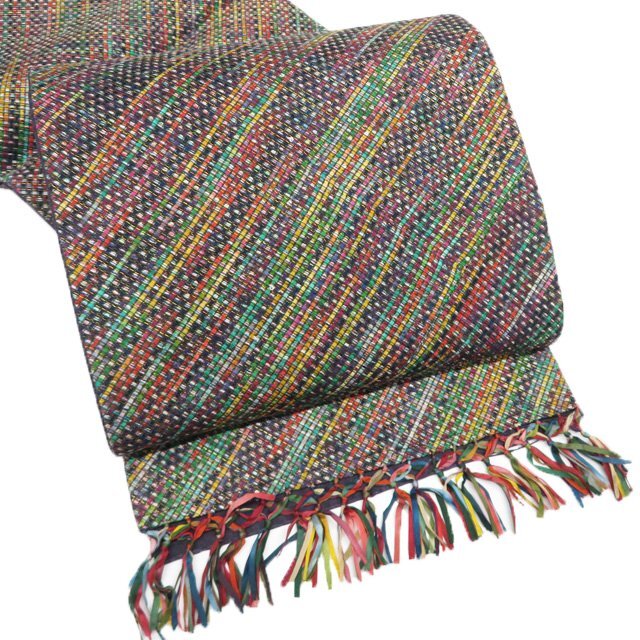 サイズ 456cm x 30.5cm 素材 正絹 商品ランク B ●お色 マルチカラー 多色 『組帯』は、古来より受け継がれる、日本の組紐の技術から生まれた帯です。 一般的な織物は経糸と緯糸が90度の角度で交差しますが、組物は2本の糸が縦方向に対して斜めに組んでいきます。 しなやかで体のカーブに沿ってしっかり締めやすい帯です。 美しい組紐の技術と軽やかな織上がりを、是非お手元にてお楽しみくださいませ。 少し締め跡はございますが、未仕立ての綺麗なお品物です。 写真に写っている帯のみの販売で、小物等の付属品はついておりません。 一部商品は実店舗・他サイトでも並行して販売しておりますので売り切れの際はご了承ください。 その他多数販売中 n | ||||||
