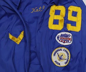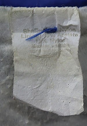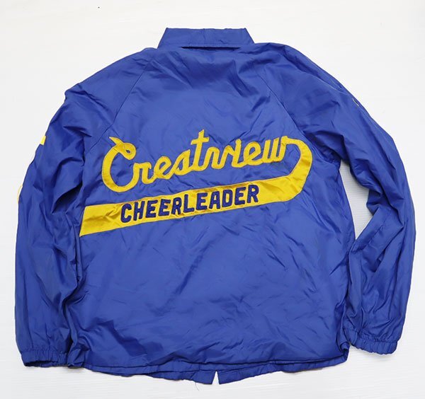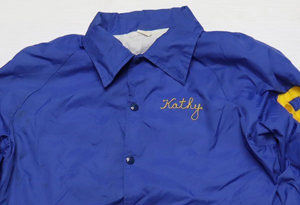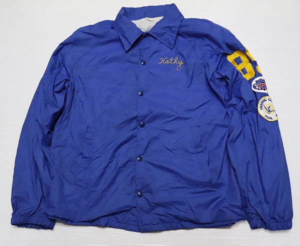 アメリカ買い付けの80-90年代頃のアメリカ製(表記はございませんが)で外装はナイロンジャケットの左胸はチェーンステッチ文字のレタード貼り付け&パッチ貼り付けでネル地系裏地の青系です。