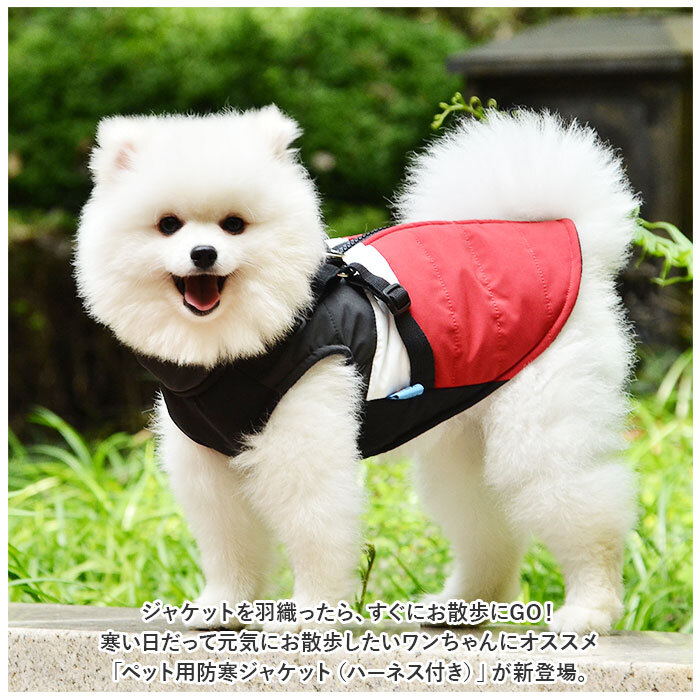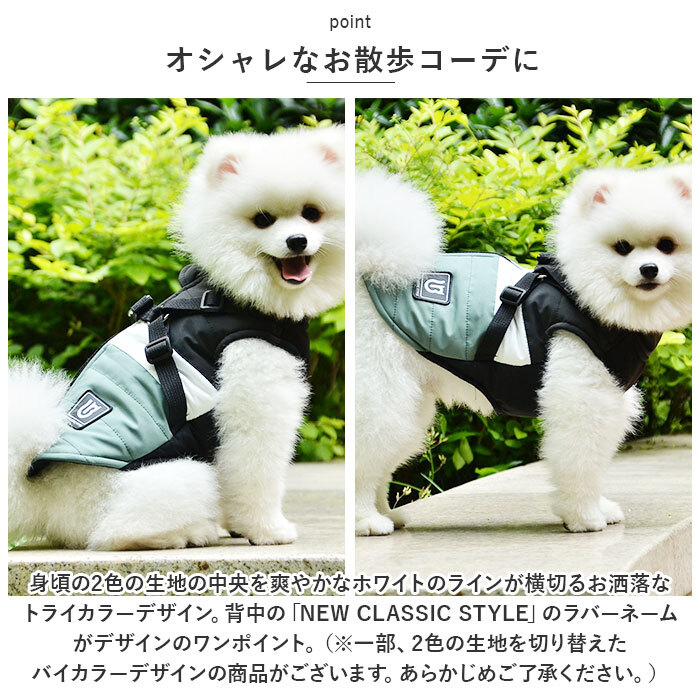 | 商品説明 | ・・ジャケットを羽織ったら、すぐにお散歩にGO!寒い日だって元気にお散歩したいワンちゃんにオススメ「ペット用防寒ジャケット(ハーネス付き)」が新登場。 ・【これ一枚で、防寒対策は万全】 ・スキーウェアのようにお洒落なジャケットの生地内側には、もこもこの中綿をたっぷりと充填。ぽかぽかの着心地で、しんしんと冷える寒い日や雪の降る日だって安心。 ・【起毛素材で暖かさをキープ】 ・ジャケットの内側は肌触りのよい起毛加工を施したフリース素材で仕上げてあるので、身体の周りの暖かな空気をしっかりとキープ。 ・【お出掛け前に簡単お着替え!】 ・広げたジャケットの丸く輪になった部分に両前脚を通してから、生地をグッと身体に近づけるように持ち上げ、背中のファスナー・バックルの順に閉めるだけで装着が簡単! ・【足が短めなワンちゃんにも】 ・よちよち歩く姿が可愛い♪コーギーやフレンチブルドッグなど手足の短めなワンちゃんでもピッタリ着れるノースリーブタイプ! ・【ハーネス一体型デザイン】 ・ジャケットを着たらすぐに飼い主さんとお出掛け!首輪やハーネスを別に装着する必要のない「ハーネス一体型デザイン」。背中のバックルをパチンと留めて、Dカンにリードを接続したらすぐにお散歩にGO! ・【安心のファスナーガード付き】 ・背中のファスナーには、肌に直接当たっても冷たさが気にならないプラスチックファスナーを採用。ファスナー上部には、被毛や皮膚を挟む心配のないファスナーガード付き。 ・【おトイレの時も安心】 ・お腹まわりやお尻は大きく開いたデザインなので、おトイレで生地を汚す心配がないのも嬉しいポイント! ・【オシャレなお散歩コーデに】 ・身頃の2色の生地の中央を爽やかなホワイトのラインが横切るお洒落なトライカラーデザイン。背中の「NEW CLASSIC STYLE」のラバーネームがデザインのワンポイント。(※一部、2色の生地を切り替えたバイカラーデザインの商品がございます。あらかじめご了承ください。) |