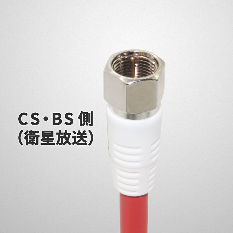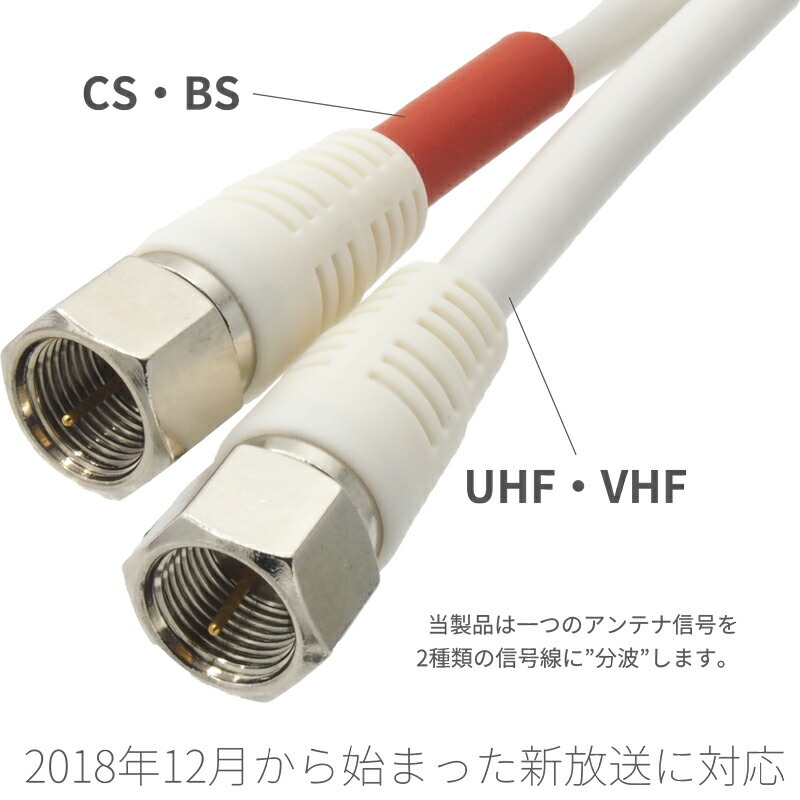 ケーブル長はそれぞれ50cmございますので、個別にテレビと衛星用チューナーへアンテナ線を接続する場合に大変便利です。別途ケーブルを用意いただく必要がございません。(当製品はケーブルを分離する事ができません。)