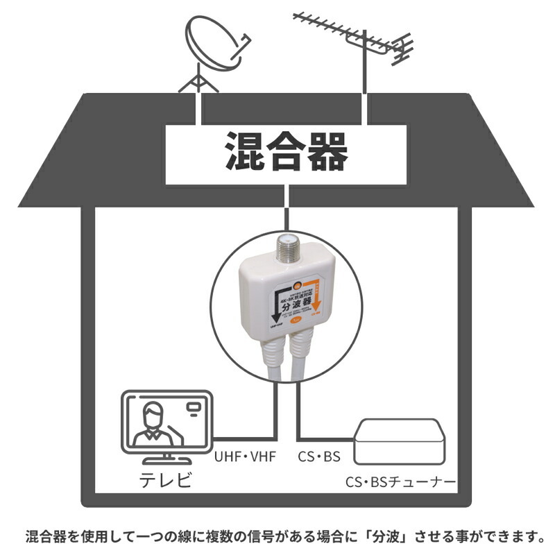 UHF及び衛星アンテナで受信したそれぞれの電波を混合された信号線と接続する事で、BS・CS(衛星放送)とUHF・CATV(地上波放送) に分波します。