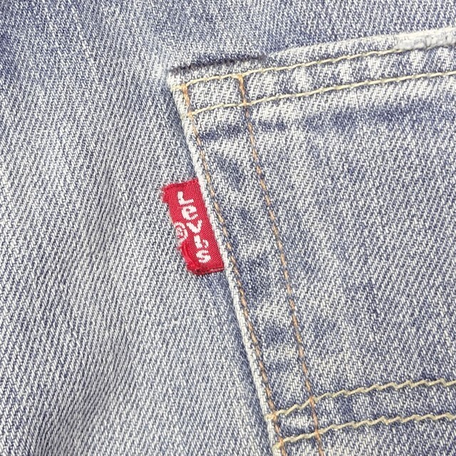・スモールeレッドタブ、アーキュエットステッチ、5ポケットリベット、クラッシュ&リペア、V字ステッチ補強