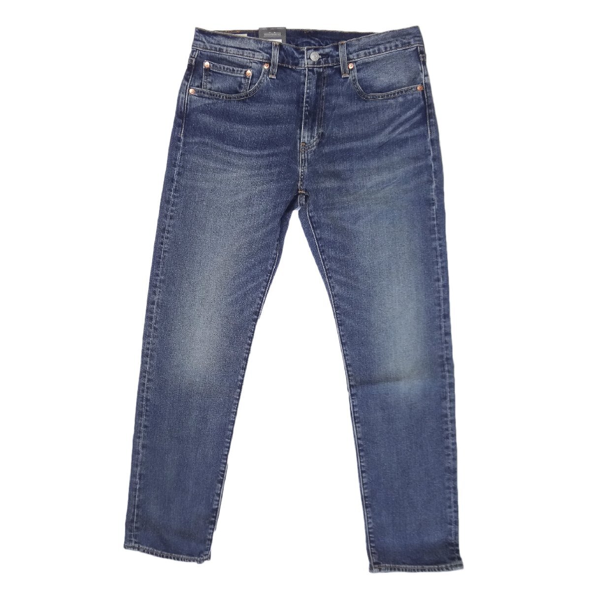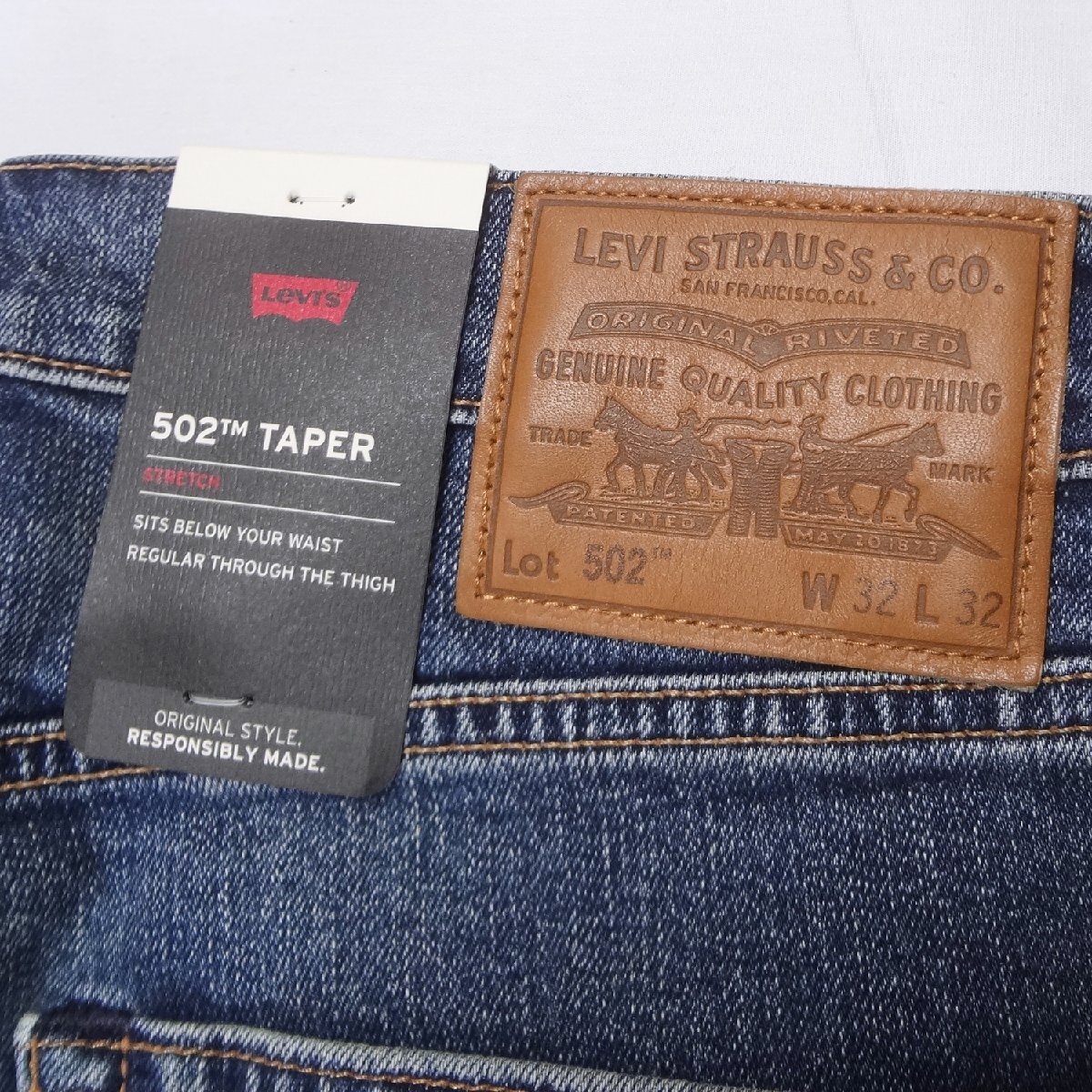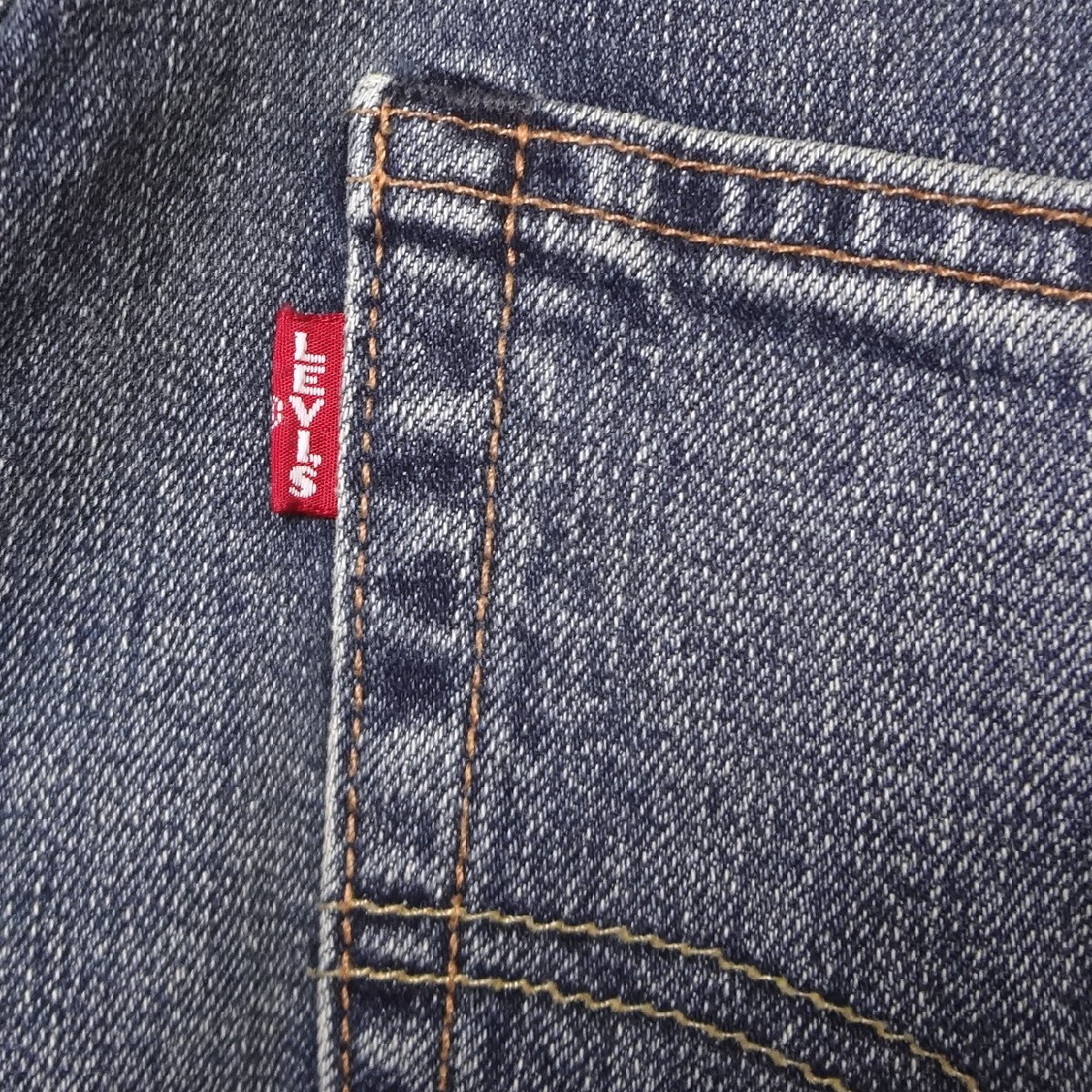 リーバイスの502ストレッチデニムジーンズ、素材/綿99%ポリウレタン1%、パッチ牛革、ミッドインディゴブルー、ダメージジーンズユーズド加工