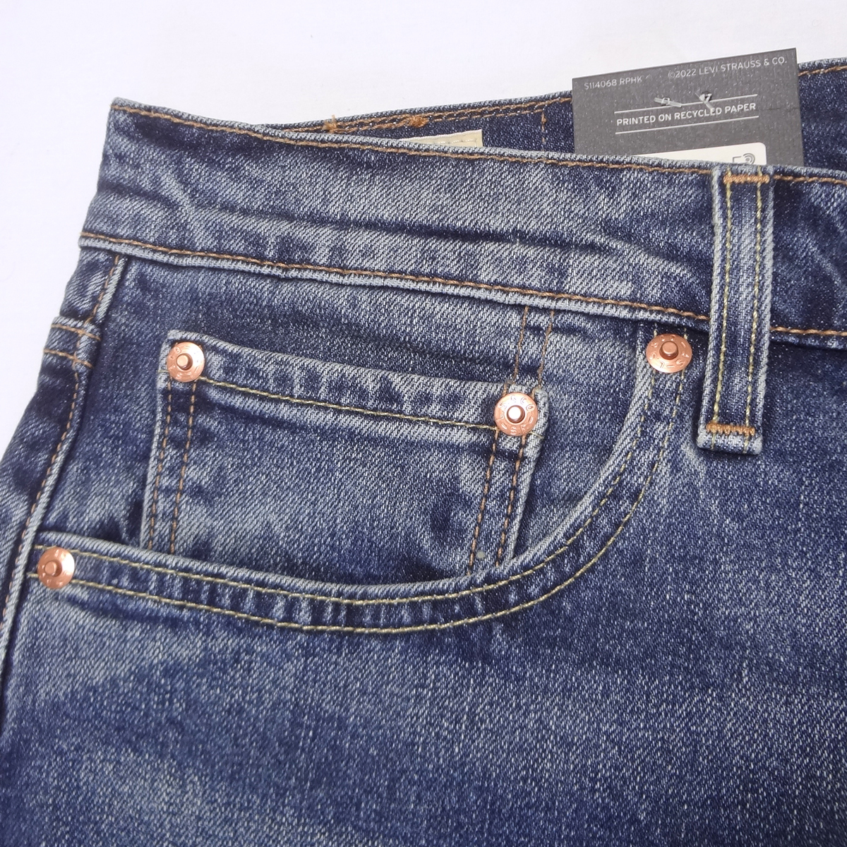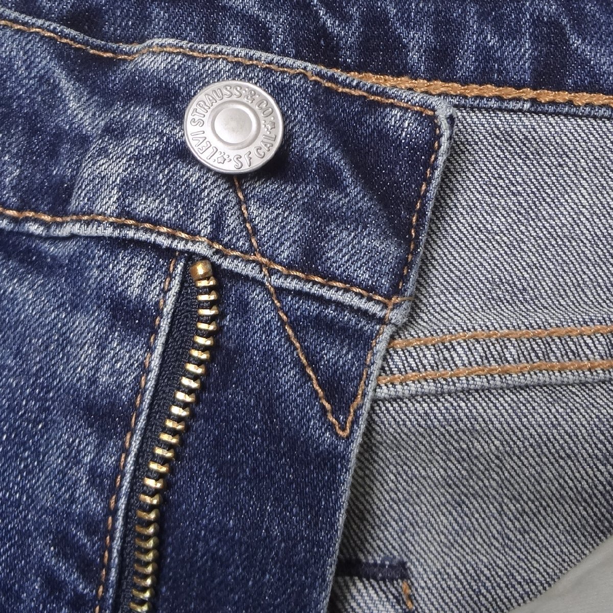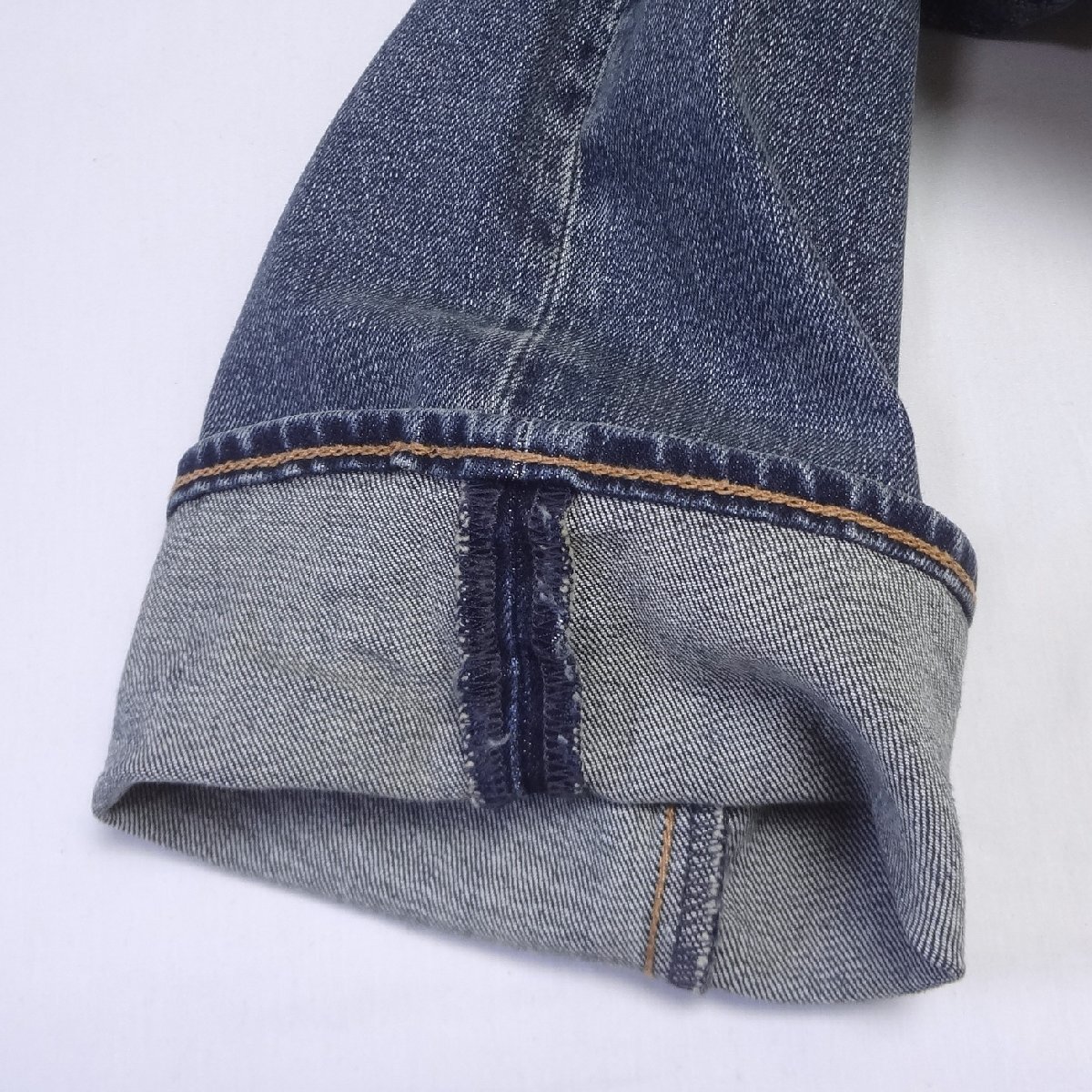 ・ビックEレッドタブ、フロントジッパー、アーキュエットステッチ、5ポケットリベット、レザーパッチ
