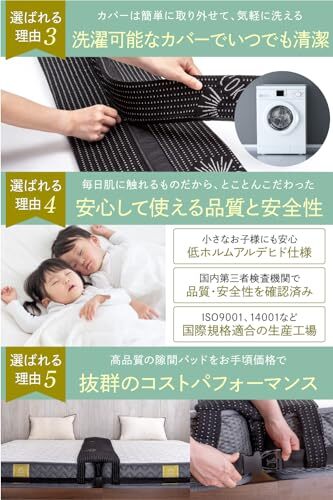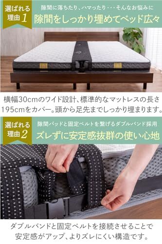 | 商品説明 | 【段差を緩和するスリム&ワイド設計】マットレスをつなげて子供と一緒に寝たいけど・・・間に隙間ができてしまう!! そんなお悩みをお持ちの方におすすめ!マットレス同士の隙間を埋めて、広々と快適な睡眠ライフを。パッド上層部分の厚みは2cmのスリム形状なので、上に乗ってもマットレスとの段差による違和感を感じにくい設計です。パッド幅30cmのワイド設計で安定感抜群、長さも標準的なマットレスの長さ195cmをカバーするので、頭の先から足先までしっかりと隙間を埋めることができます。 【隙間をしっかり埋める硬さと長さ】中材には隙間をしっかり埋める硬さを持つ高反発ウレタンを使用。 隙間に差し込む部分の長さが8.4cmあるので、奥までしっかり入り込み、 ズレにくく快適です。 【安定感抜群の固定ベルト+ダブルバンド仕様】長さ10m、 幅4.2cmの固定ベルトにはバックルとアジャスター付きで、着脱や調整も簡単!ベッド幅最大300cmまで幅広く対応可能です。固定ベルトとマジックテープ接着のダブルバンドとを接続させることで安定感がさらにアップしました。 【パッドだけ外せるので、カバーの洗濯時に便利!】固定ベルトはそのままに隙間パッドのみを外すことができるので、隙間パッドのカバーをお洗濯する際もとっても便利です。差込部と上層部は分離でき、 カバーが取り外しやすい工夫も。 お洗濯の際は中のウレタンを取り外し、カバーのみ洗濯機で洗ってください(※洗濯ネットをご使用ください。中材のウレタンはお洗濯できません。)。 【抗菌・防臭カバー・低ホルムアルデヒド仕様】カバー生地には抗菌・防臭加工を施し、ニオイの原因となる細菌の繁殖を抑え、気になるニオイを防ぎます。低ホルムアルデヒド仕様でお子様にも安心してお使いいただけます。 【安心の1年間品質保証付き】万が一の初期不良やその後正常なご使用状態のもとに生じた不具合もご購入より1年間、保証対応をさせていただきます。 【商品仕様】●サイズ : (隙間パッド)幅約30cm×長さ195cm×高さ10.4cm、 (固定ベルト)幅約4.2cm×長さ10m ●材質 : ウレタンフォーム ●側生地 : ポリエステル65%、レーヨン35% ●カラー : ブラック ●製品重量 : 約1.14kg ●化粧箱サイズ : 19×19×40cm ●日本語取扱説明書 ●安心の1年間保証書 ●低ホルムアルデヒド仕様 ●製造国:日本企業開発/イタリアデザイン/中国専用工場生産