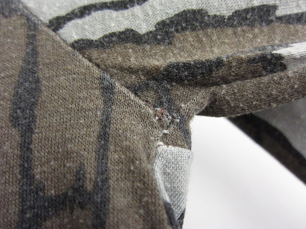 | 全体の状態 | 襟の左肩側に縫い直しのリペア、左袖肩の縫い合わせ部分に少しステッチ抜けによる穴があります。右袖脇にほつれ穴があります。袖先にピンホールがあります。広域に薄いシミ汚れなどが見られます。 使用感はありますが、普段古着慣れしている方ならまだまだ着用していただけます。是非ご検討ください。 |