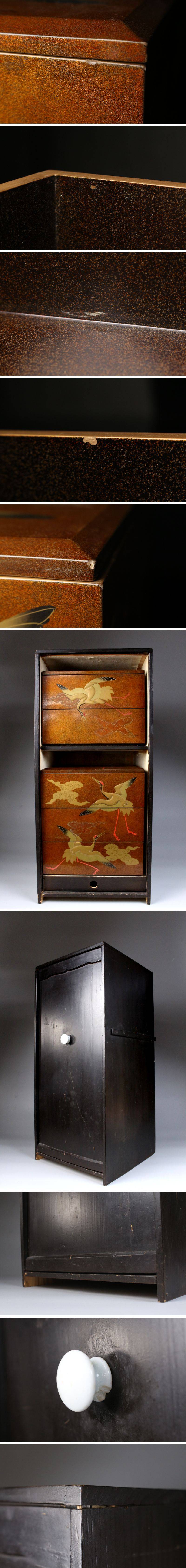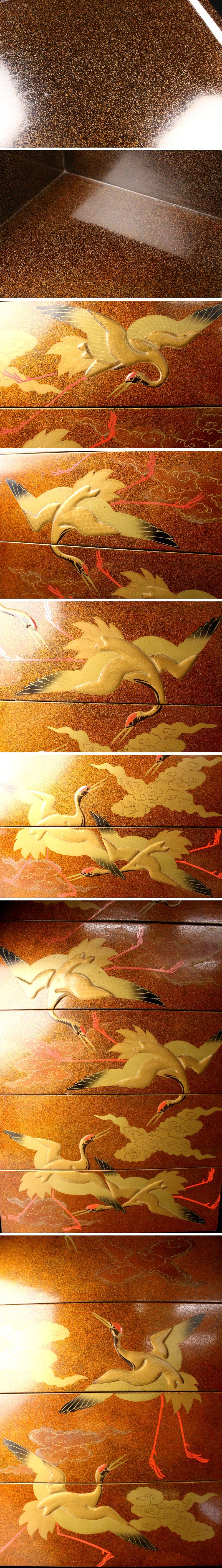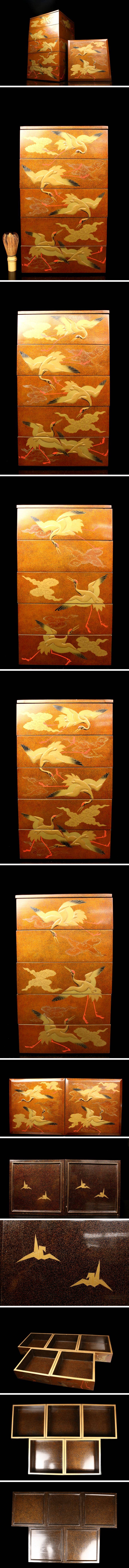 [.QU]25.10 25102316T* * * 商品詳細 * * * ここでしか出逢うことのできない唯一の美をご紹介させて頂きます。 本品は全面に豪華な梨地が施され、内側に至るまで煌びやかな輝きを放つ 極上のお品のご紹介です。 側面には舞い上がる鶴を高蒔絵で表現することで、どの角度から見ても躍動感に溢れています。 まさに四方隙の無い贅沢な逸品。 日本の雅をご堪能出来る逸品をこの機会に是非お手元にてご堪能ください。 ■商品内容/ 重箱5段、重箱蓋2枚、箱 ■サイズ/四方24.5㎝×高43㎝ 箱:横27㎝×高60㎝×奥行27.5㎝ ■状態/経年による スレ、傷、汚れ、欠け、剥がれ 箱にスレ、傷、汚れ、曲がり、曲がりによる外れ、欠けがございます。 ※写真にてご確認、ご了承の上ご入札下さい。