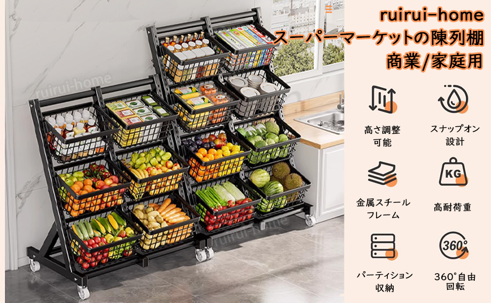 ガードーマット付き野菜などの軟らかい製品を壊れないように保護します。 家庭、小売店、商業用途に最適です。 スーパー、薬局、コンビニ、寮、リビングルーム、寝室、キッチンなどの場所で、果物、野菜、本、おもちゃ、農産物、玉ねぎ、ジャガイモ、スナック、複数回購入できるその他の小さな食品を保管するために使用できます。 収納バスケットを上下に動かすことで、各層間の高さをバスケット内の物の高さに合わせて調整することができます。収納バスケットはスナップオン設計で、さまざまな環境に応じてバスケットの配置を調整でき、分解や収納が簡単です。